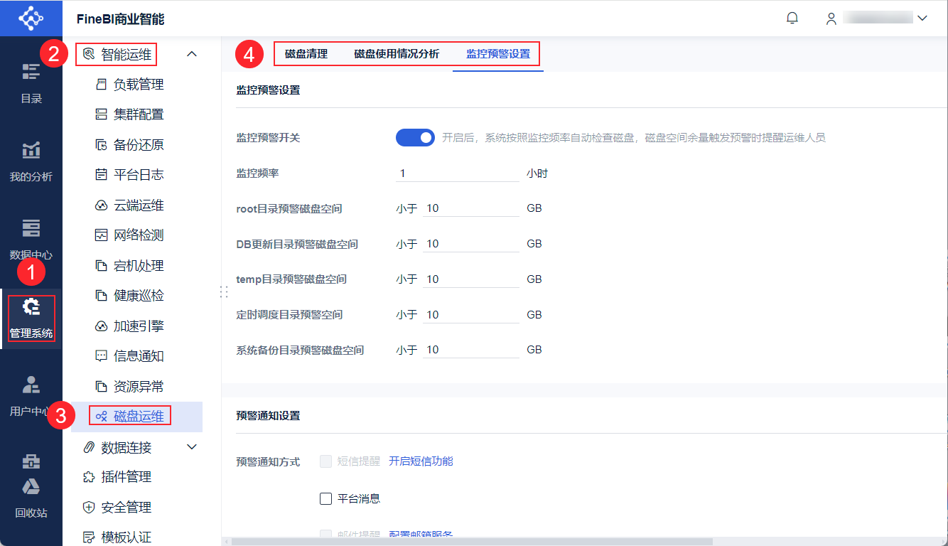 登录 BI 后 ,你可以在「管理系统>智能运维>磁盘运维」,即可查看磁盘空间,同时你可以设置预警监控。