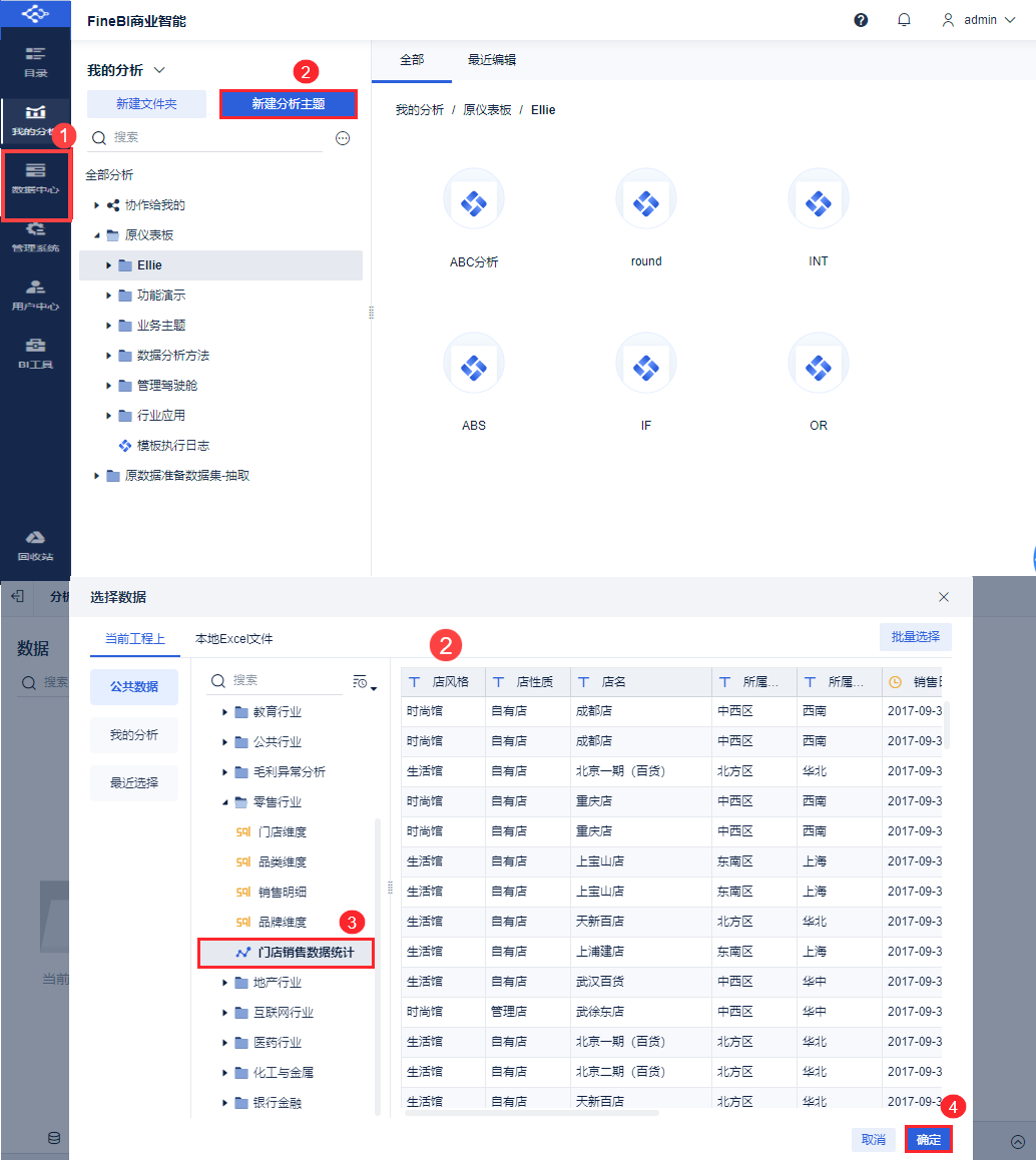 1)在「我的分析」下创建「帕累托分析」主题,选择内置公共数据中的「门店销售数据统计」,点击「确定」添加数据,如下图所示: