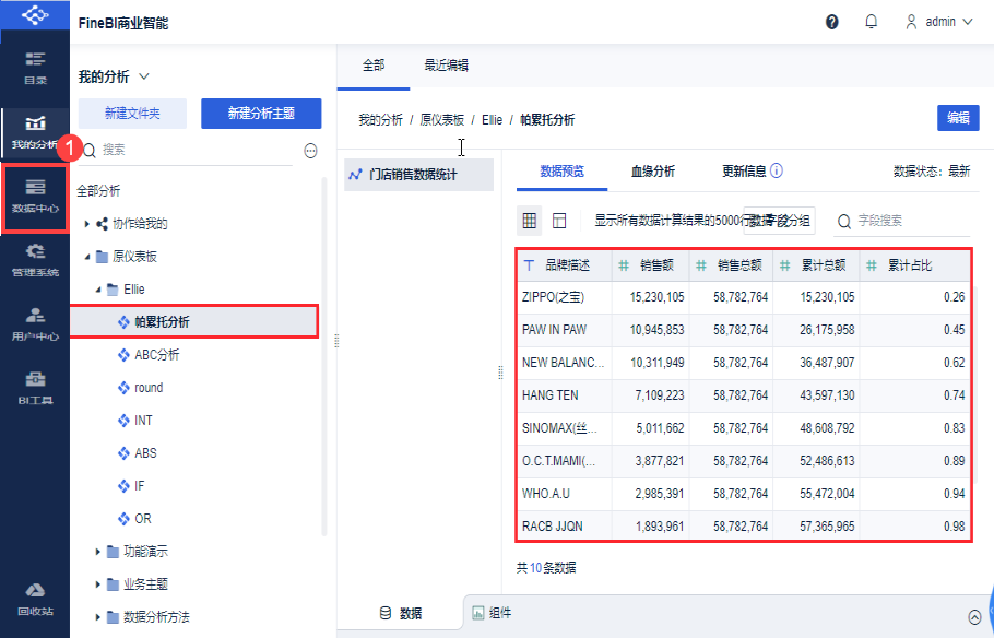 内置公共数据中的「门店销售数据统计」为例,对各大品牌的销售额进行帕累托分析,并得出公司最重要的品牌。