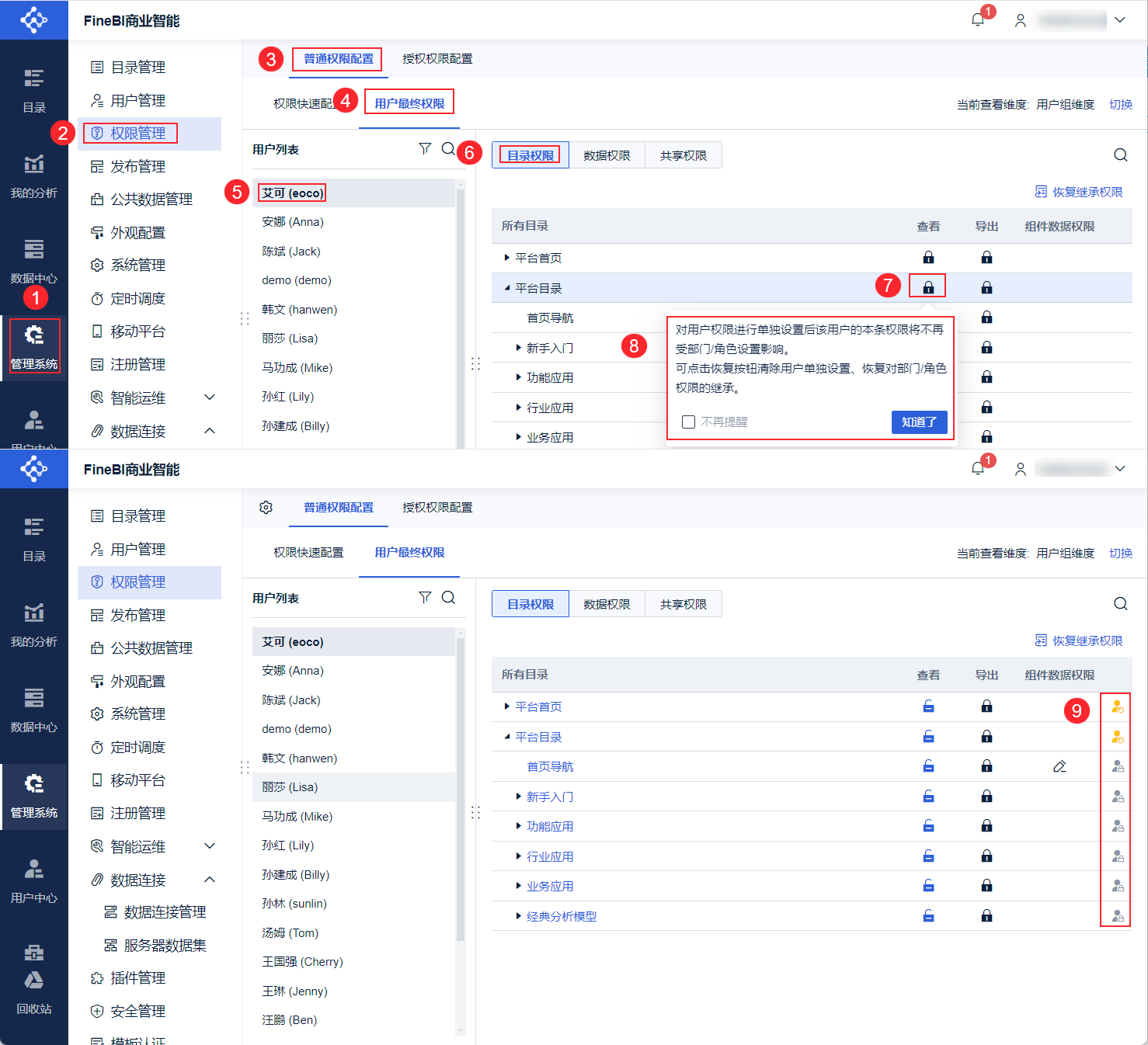 在企业的数据应用中,经常存在这样的场景:对于同一个表,希望不同的人访问时只能看到自己有权限的数据,比如本部门或者本业务线的某些数据行,或者是某些特定的数据字段只对部分用户开放(例如只有负责人能看见薪资,其他人只能看到基本的个人信息)。针对这个场景,FineBI拥有行列权限的配置能力。