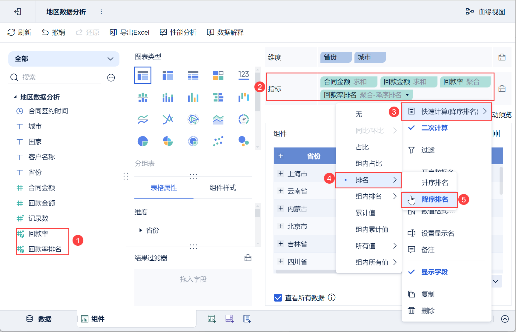 2)「回款率」和「回款率排名」字段拖入指标栏。