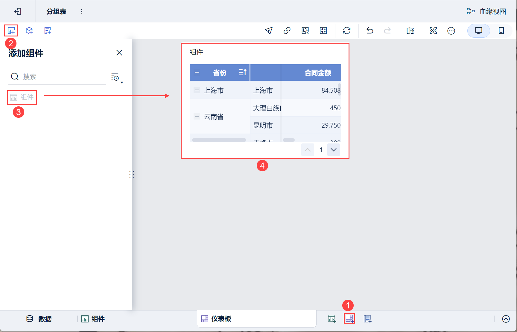2)进入仪表板编辑界面,将分组表组件拖入至仪表板中。