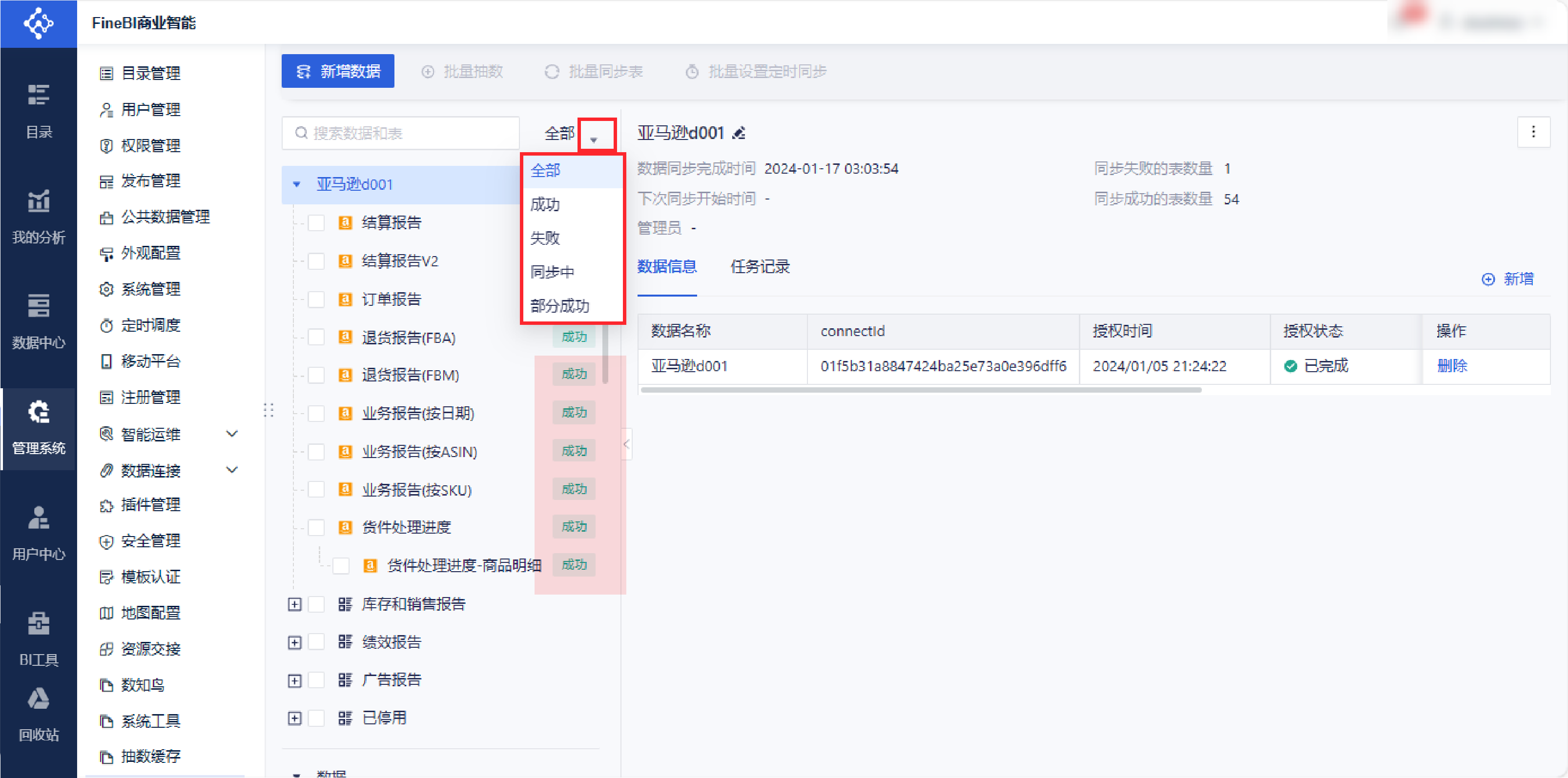 部分成功:一个数据源下的多个数据连接(站点),部分同步成功