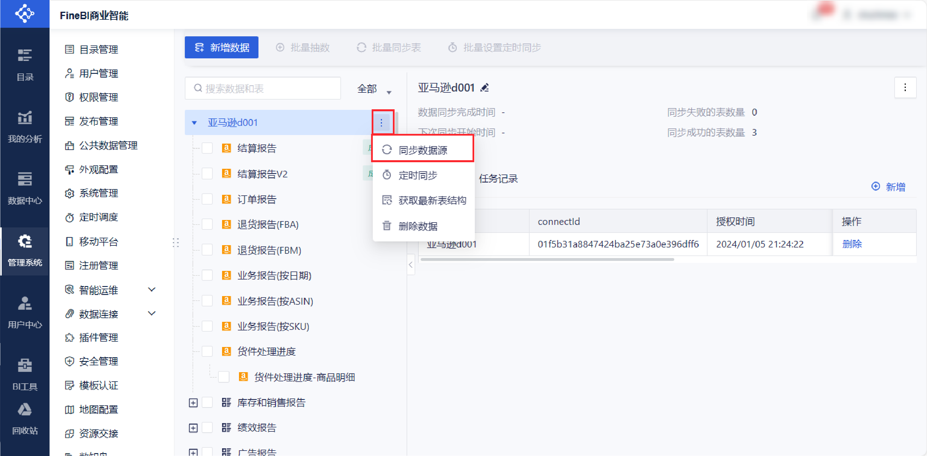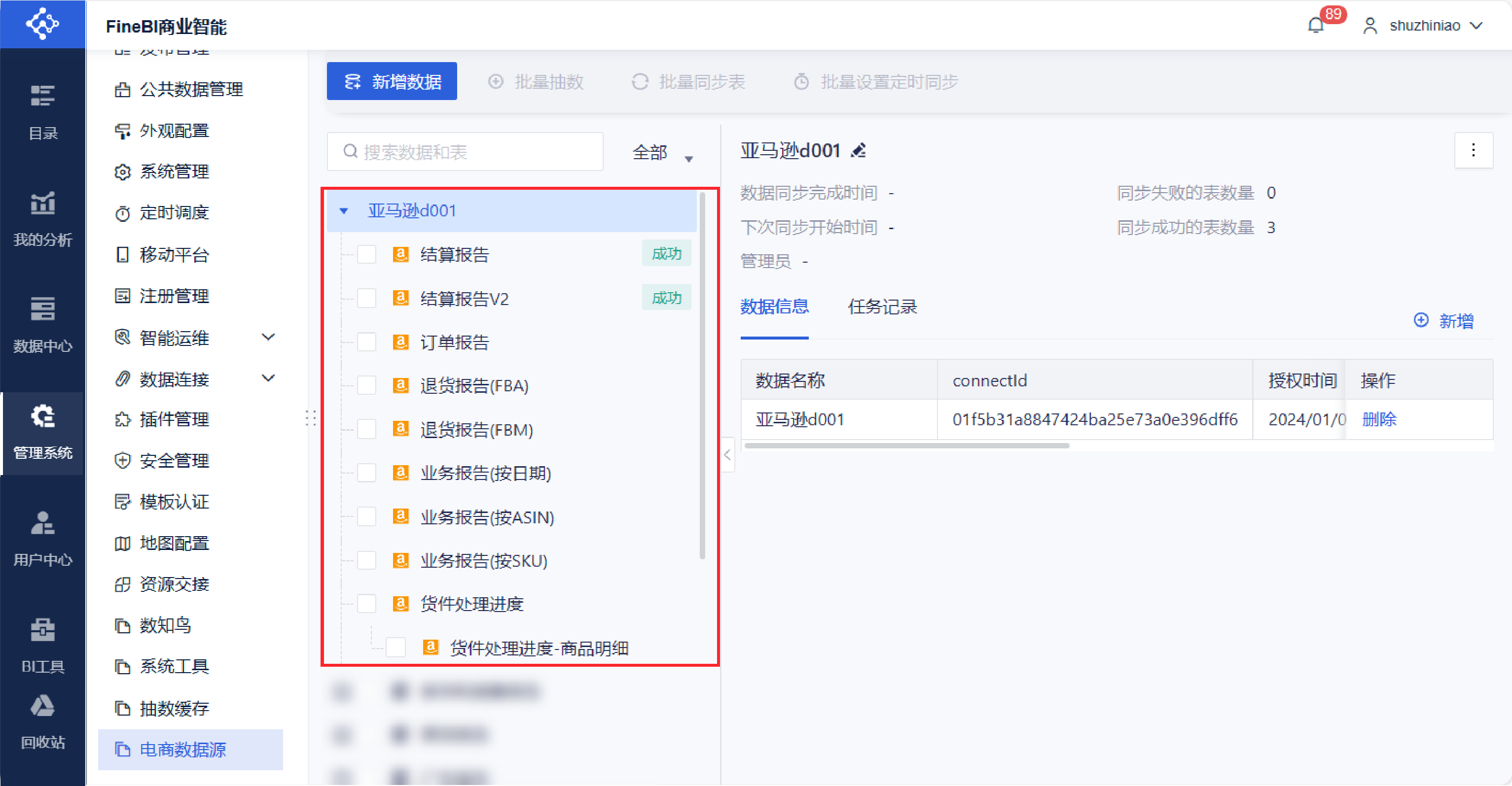安装好插件后,就可以将电商数据同步到 MySQL 数据库中,以便于 FineBI 直接从 MySQL 取数分析。