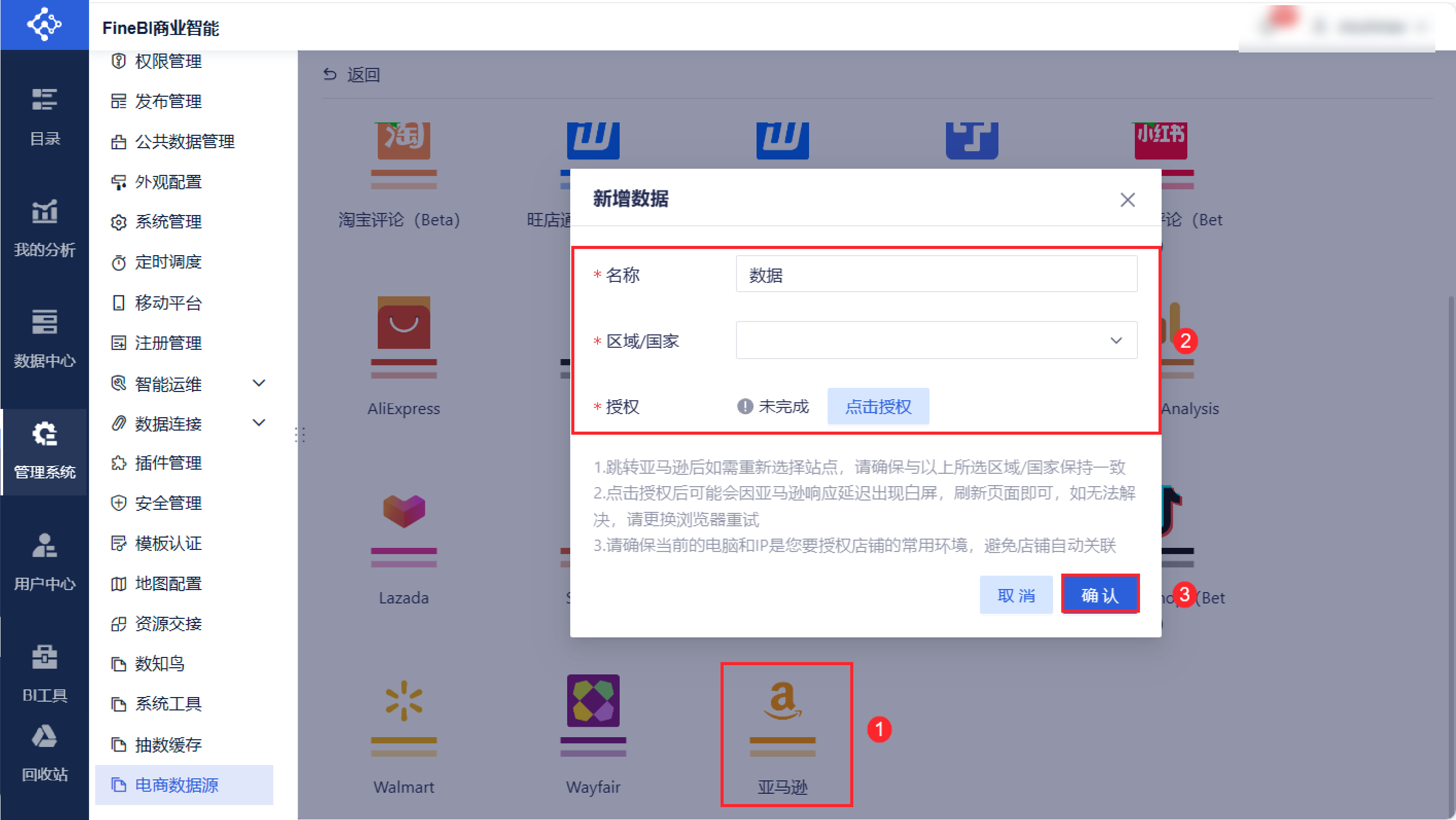 FineBI 需要获得第三方平台的授权,才可以将数据新增进来。