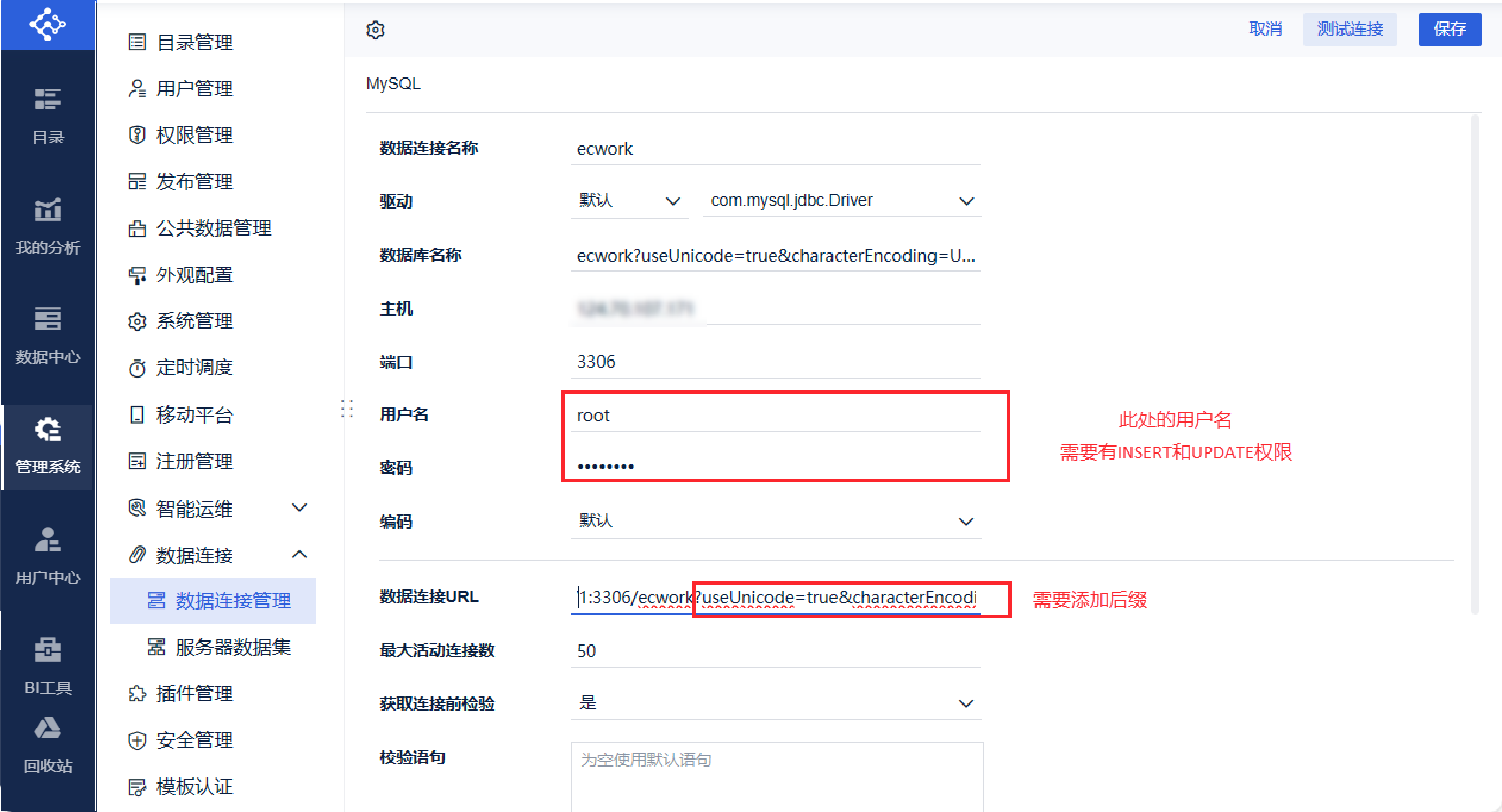 注:数据连接中的用户需要有 INSERT 和 UPDATE 权限