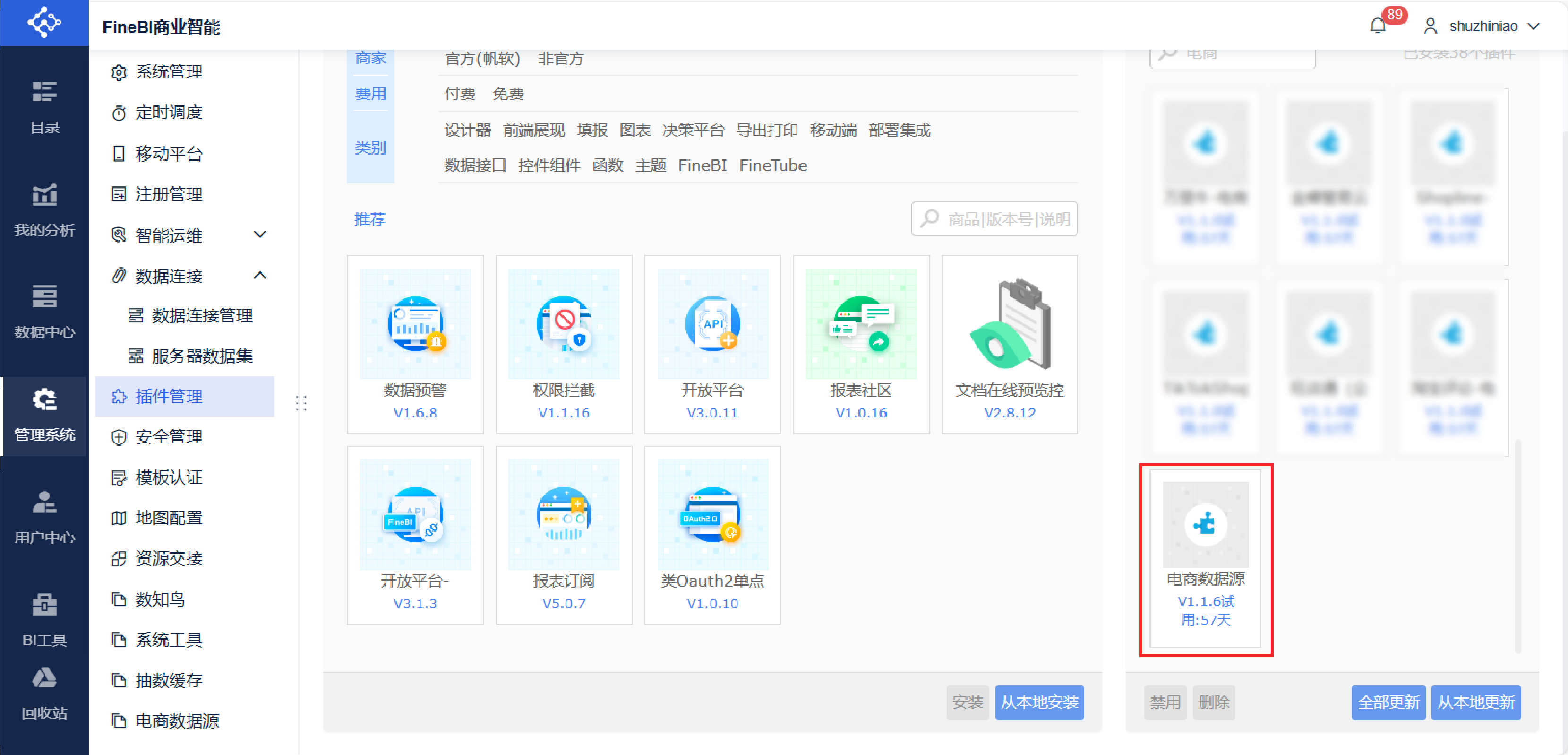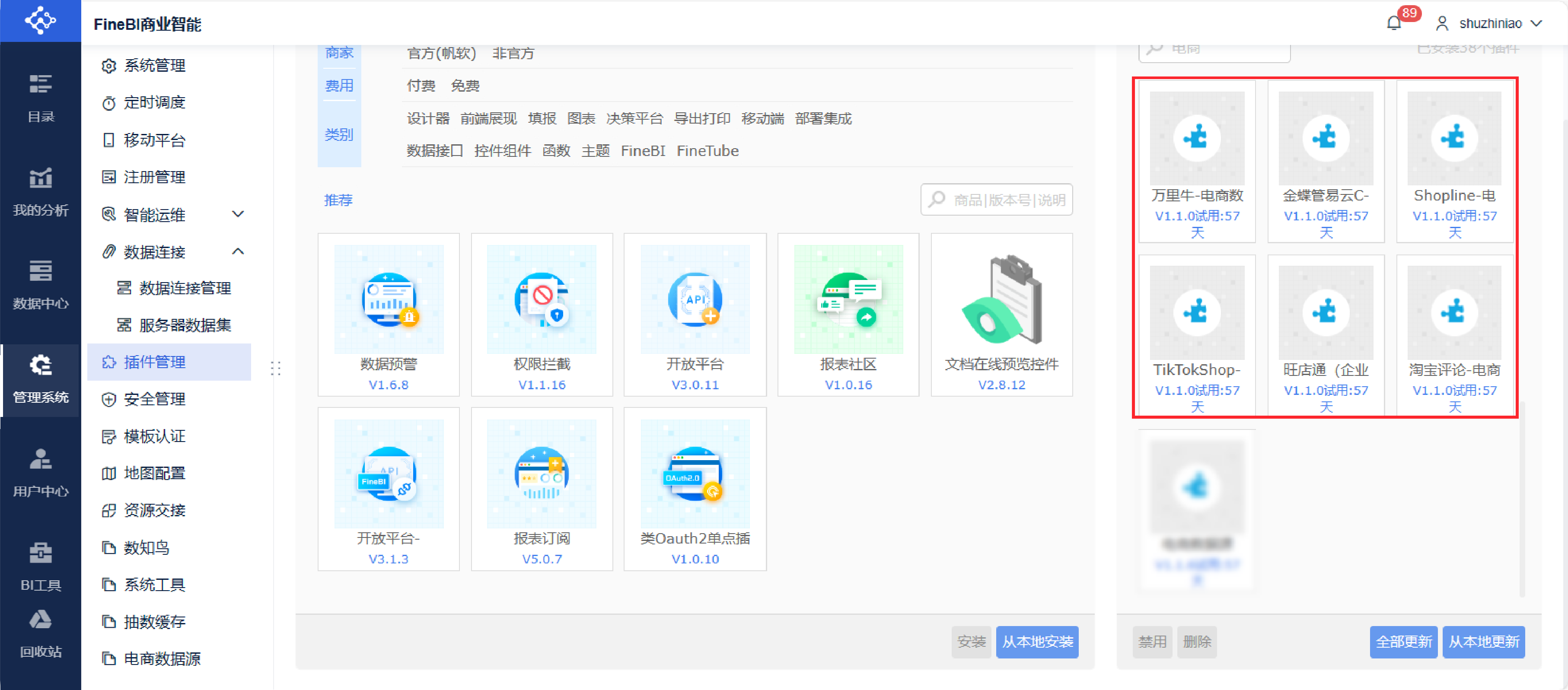 2)安装电商平台插件。不同的电商平台数据,需要安装对应的插件后才可使用。