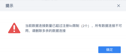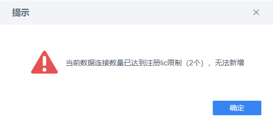 1)用户新增数据连接时报错「当前数据连接数量已达到注册lic限制(x个),无法新增」。如下图所示: