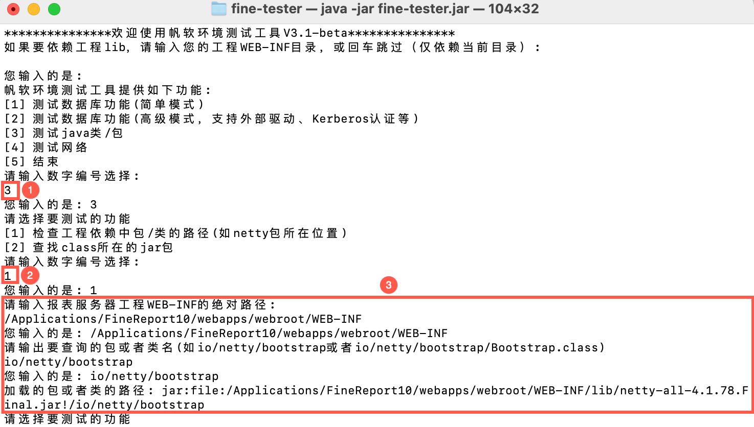 启动工具后,输入数字编号 3 进入「测试 java 类/包」模式,根据提示输入信息后,对工程依赖包的位置进行排查。如下图所示: