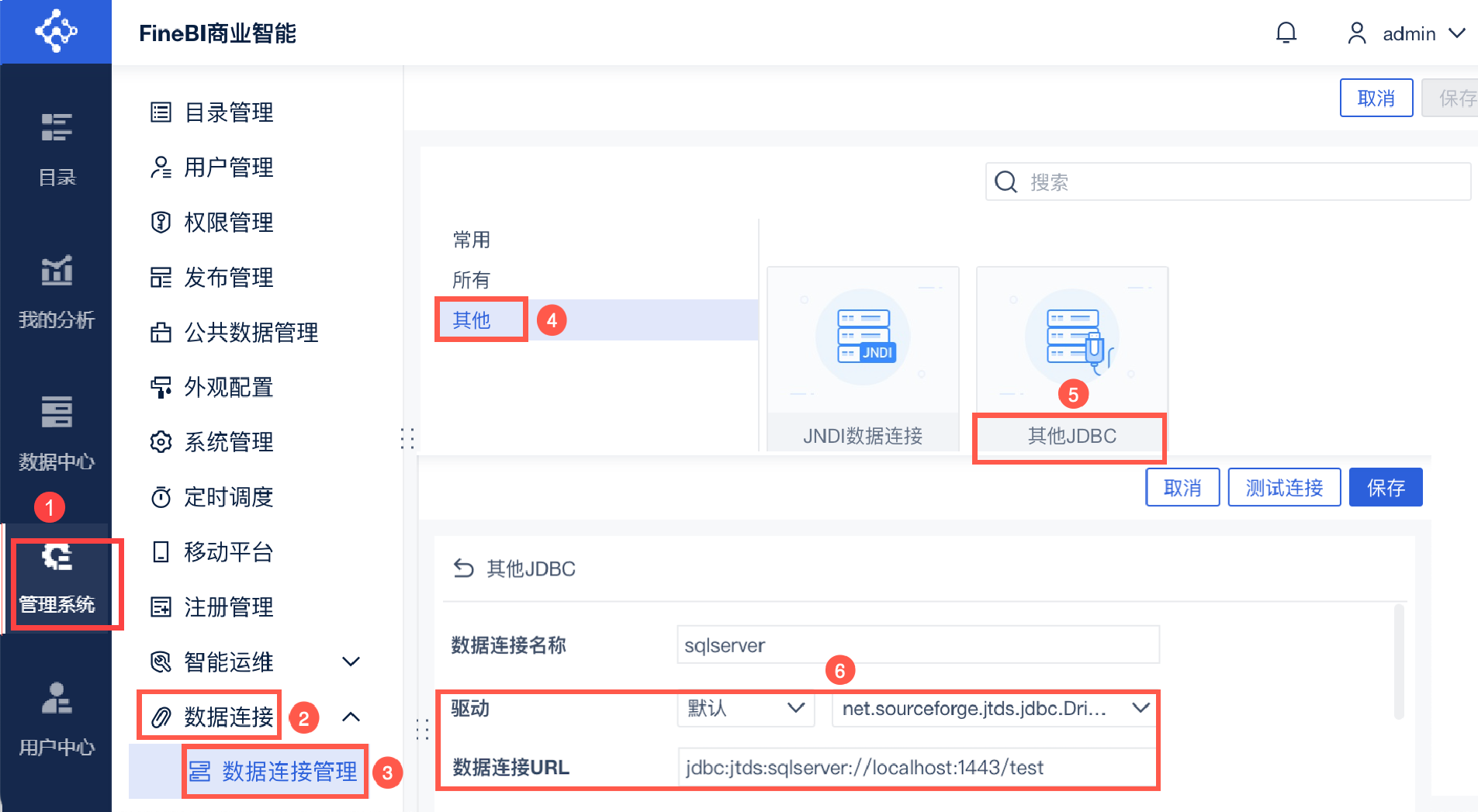 使用「 jtds-1.2.2.jar」驱动连接数据库时,数据库类型选择「其他JDBC」,手动输入「 URL 」和「驱动器」。