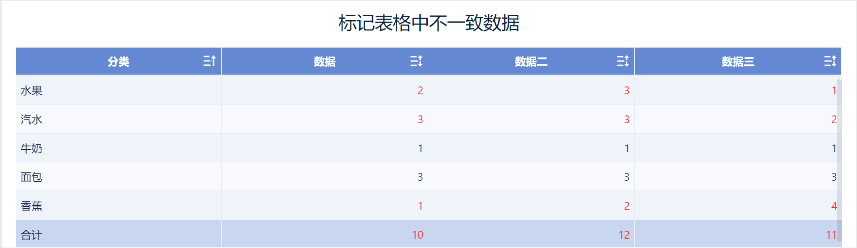 对于表格数据,若三列数据不一致,则希望将其标红。