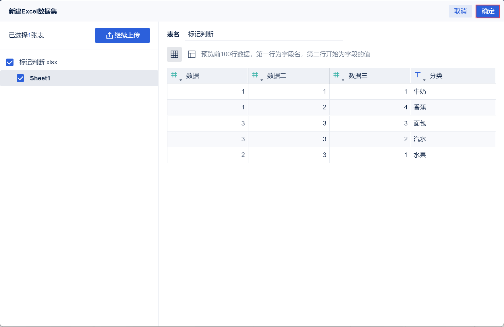 2)点击「本地Excel文件>上传数据」,上传表数据。如下图所示: