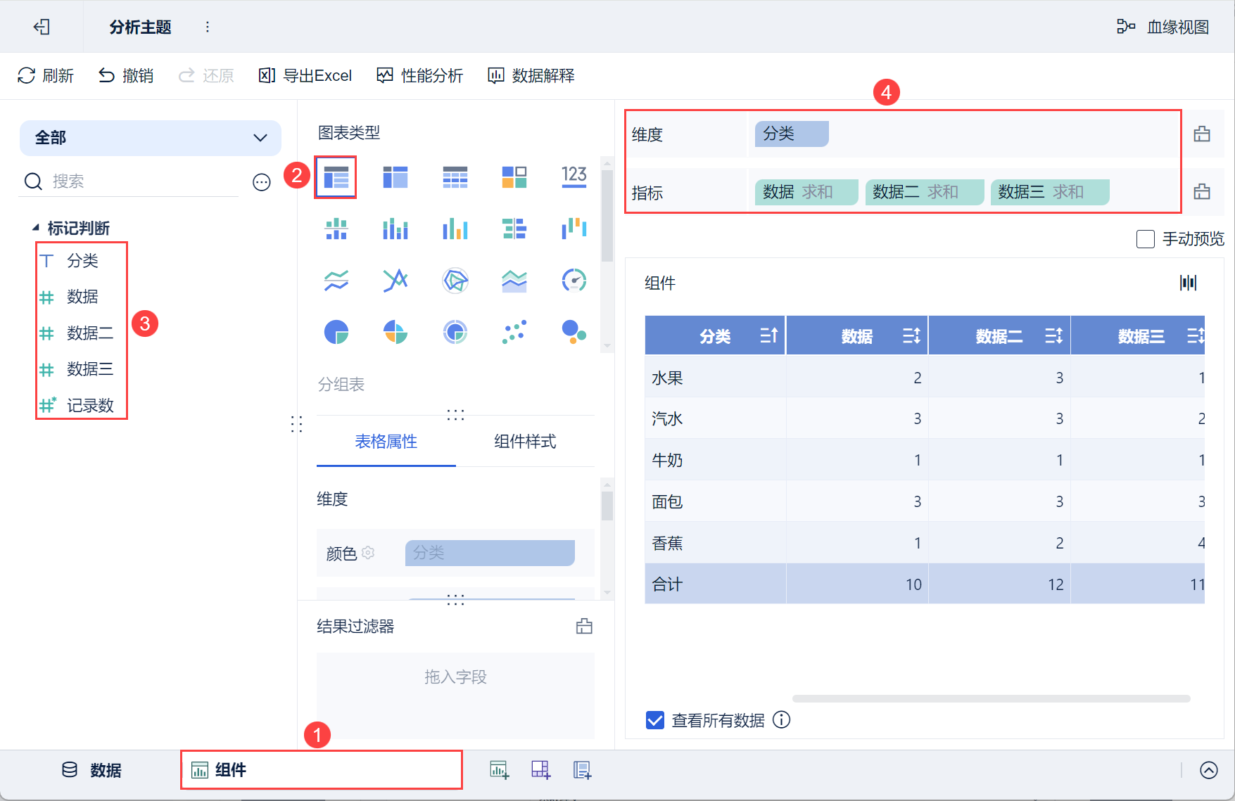 3)将待分析区域的「分类」拖入维度栏,「数据」「数据二」「数据三」拖入指标栏,如下图所示: