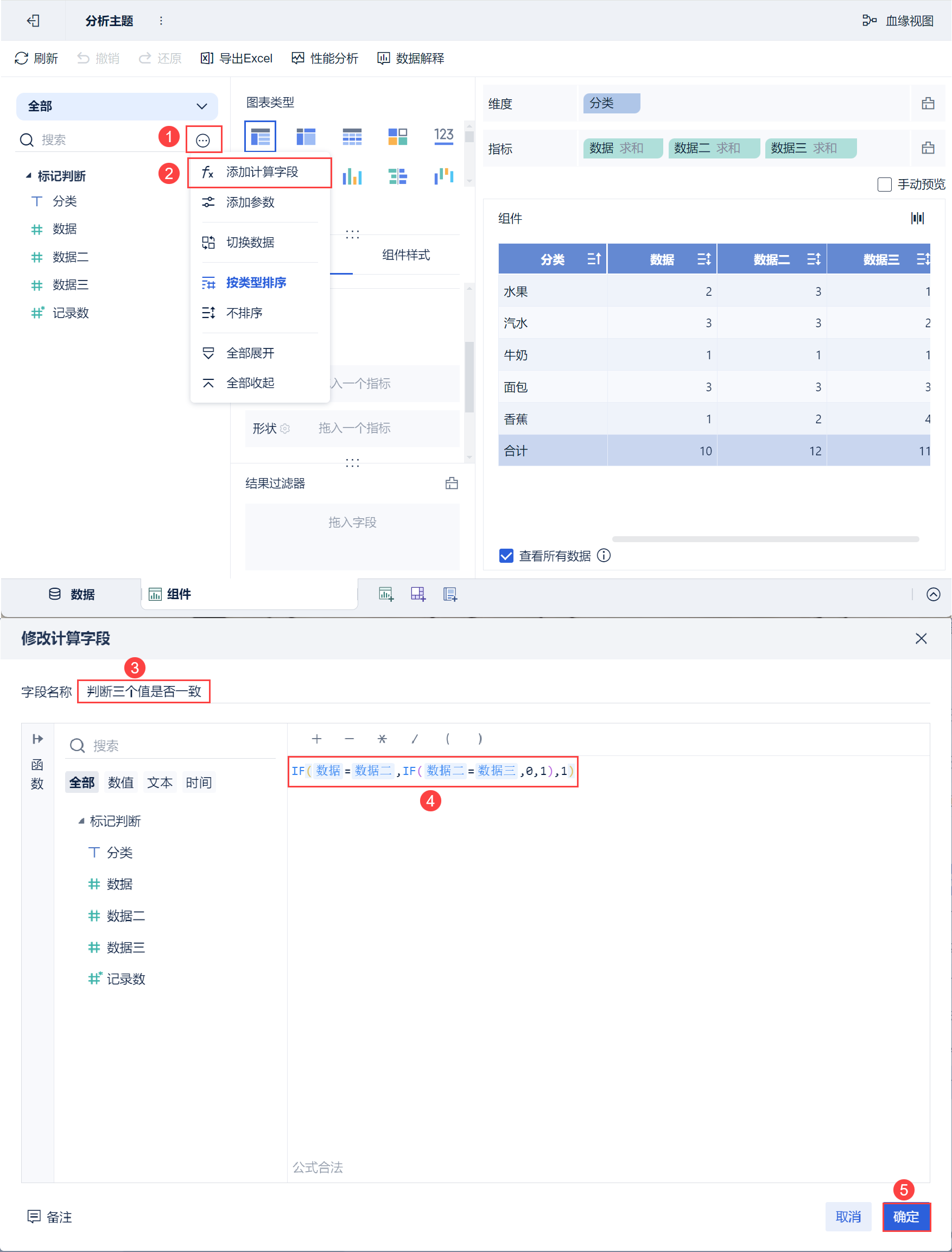 4)点击「确定」,「判断三个值是否一致」计算字段添加成功,如下图所示: