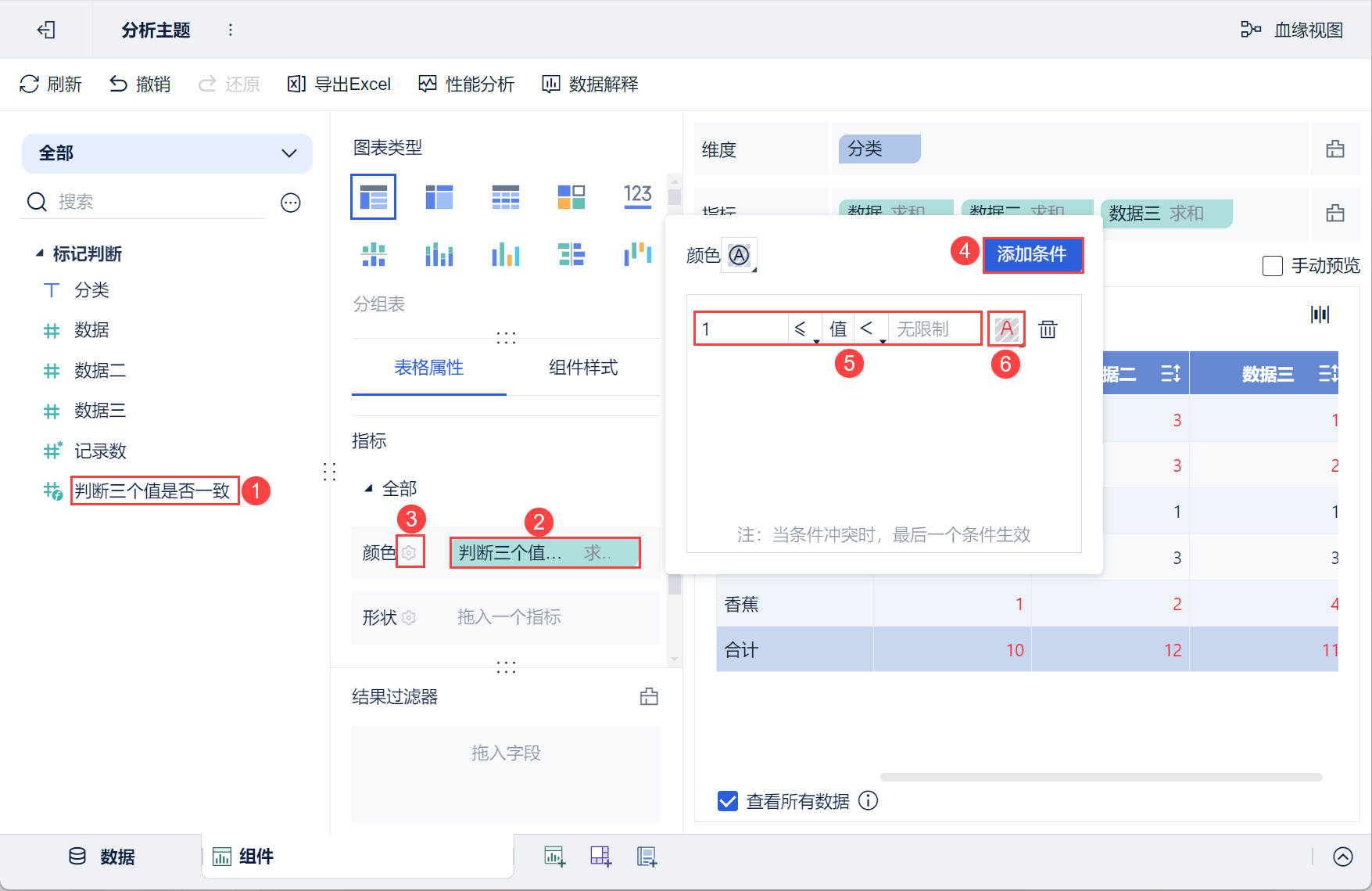 1)将左侧待分析区域的「判断三个值是否一致」字段拖入「表格属性>指标>全部」中的「颜色」栏。