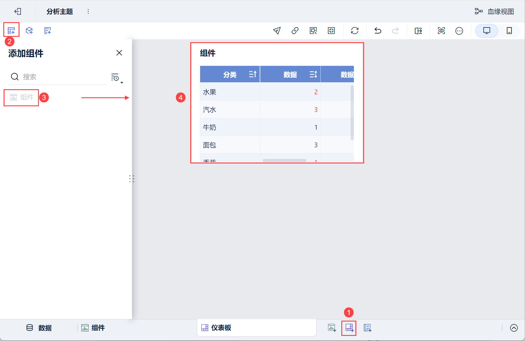 2)进入仪表板编辑界面,将组件拖入至仪表板中。