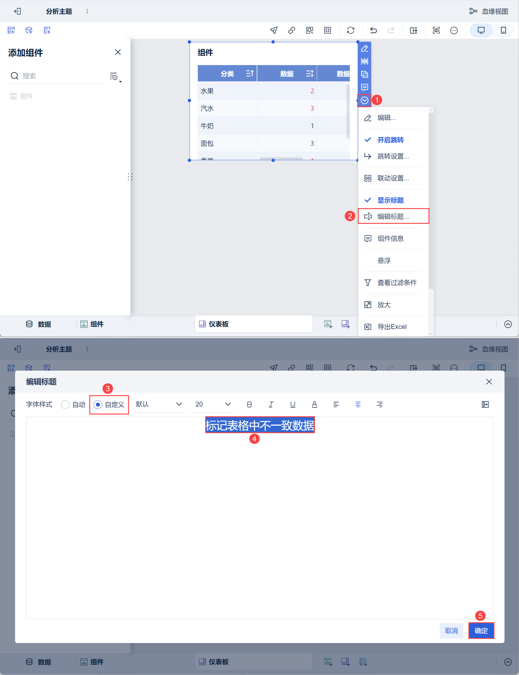 3)下拉选择「编辑标题」,样式选择「自定义」,设置标题为「标记表格中不一致数据」,点击「确定」。如下图所示: