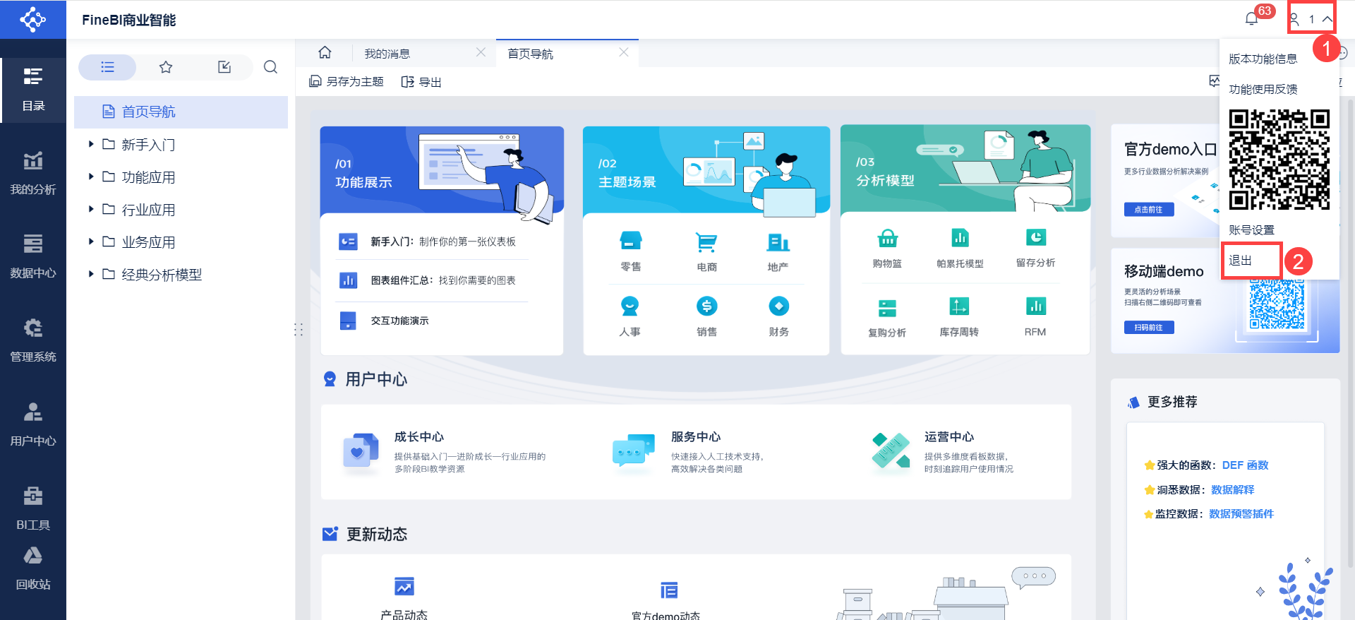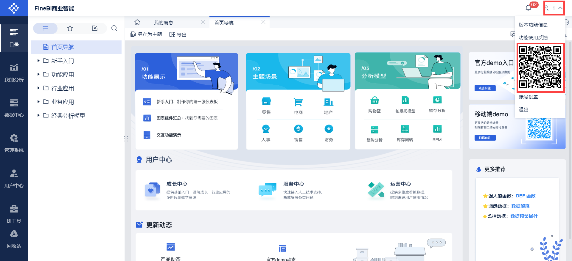 用户登录FineBI系统后,点击左上角用户名,即跳出该二维码。如下图所示: