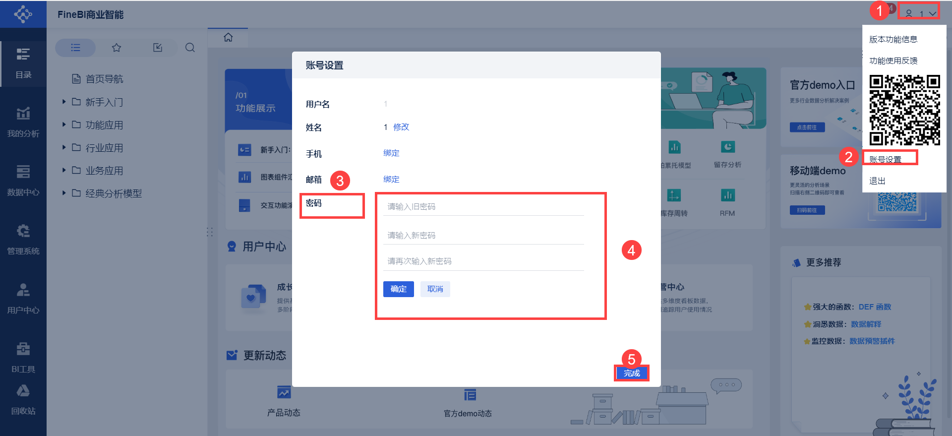 FineBI工程提升了「修改密码接口」的安全性,在自行修改密码时需要一般需要输入旧密码作为更新密码的验证。