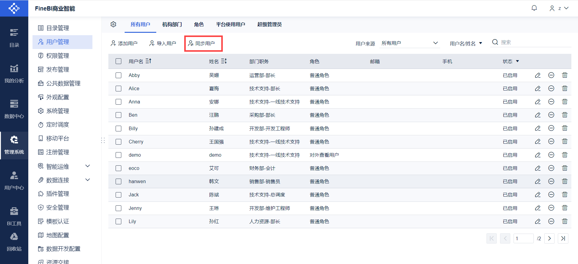 超管登录数据决策系统,点击「管理系统>用户管理>所有用户>同步用户>立即同步」,如下图所示: