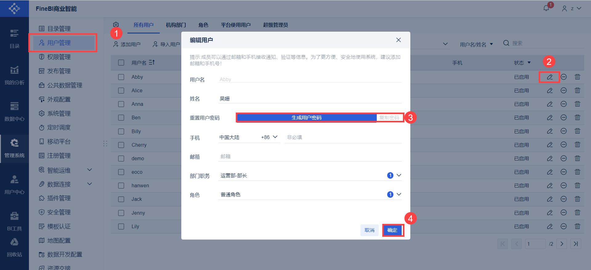 管理员登录数据决策系统,点击「管理系统>用户管理」,找到该用户,点击「编辑>生成用户密码>复制密码>确定」,如下图所示