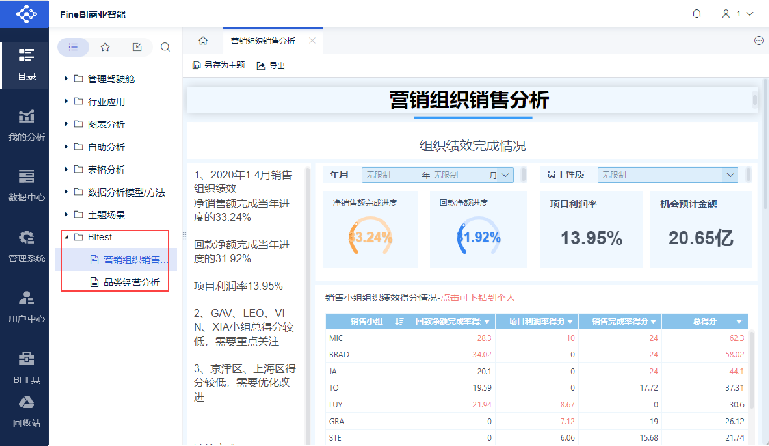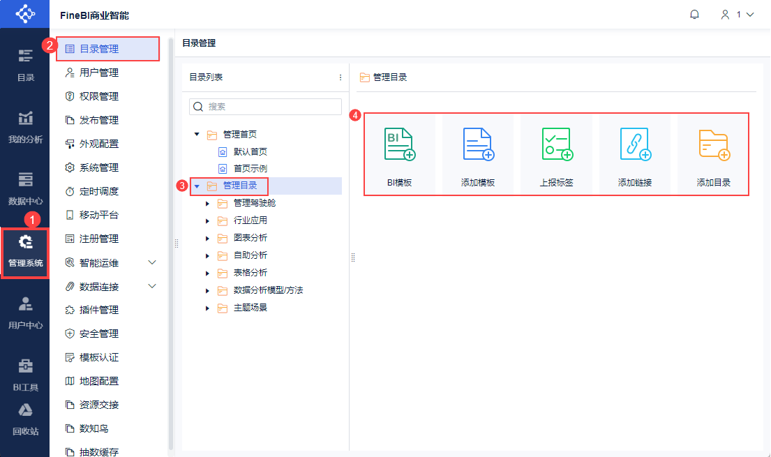 管理员登录FineBI系统,点击「管理系统>目录管理」,在目录树管理界面中可调整目录和模板的顺序。
