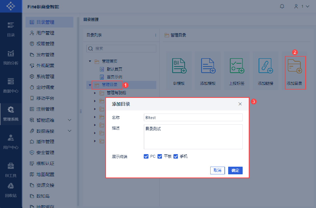 管理员登录FineBI系统,点击「管理系统>目录管理>管理目录」,选择「添加目录」,弹出如下对话框,输入文件夹名字,可对添加的文件夹进行描述等。