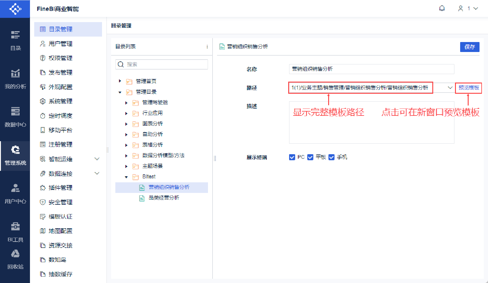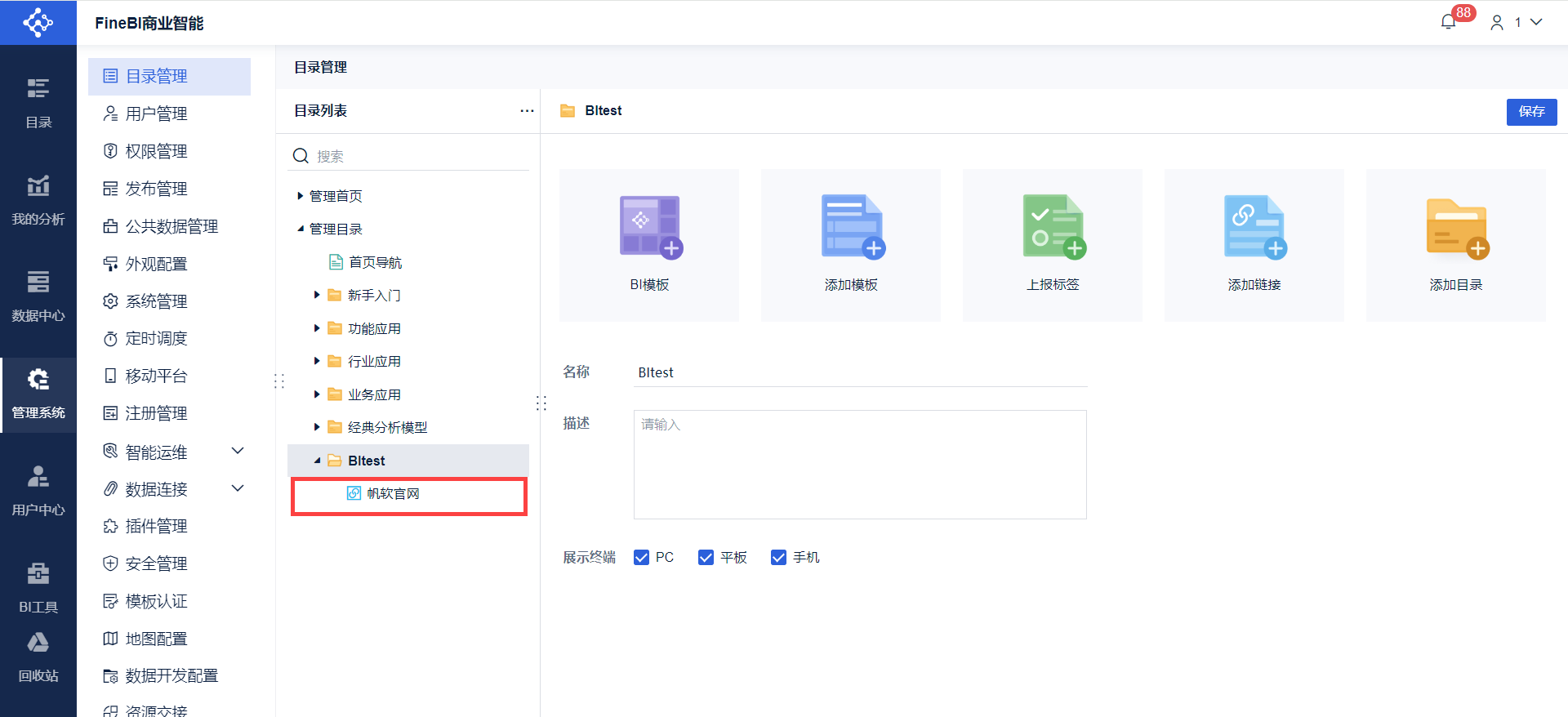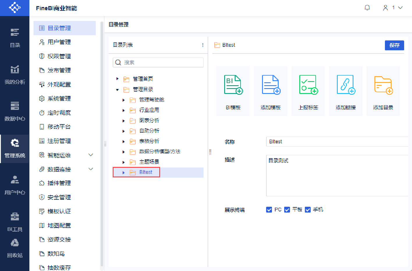 选中目录BItest ,右侧可以直接修改该目录的名称、描述、展示终端等设置,点击「保存」即可。如下图所示: