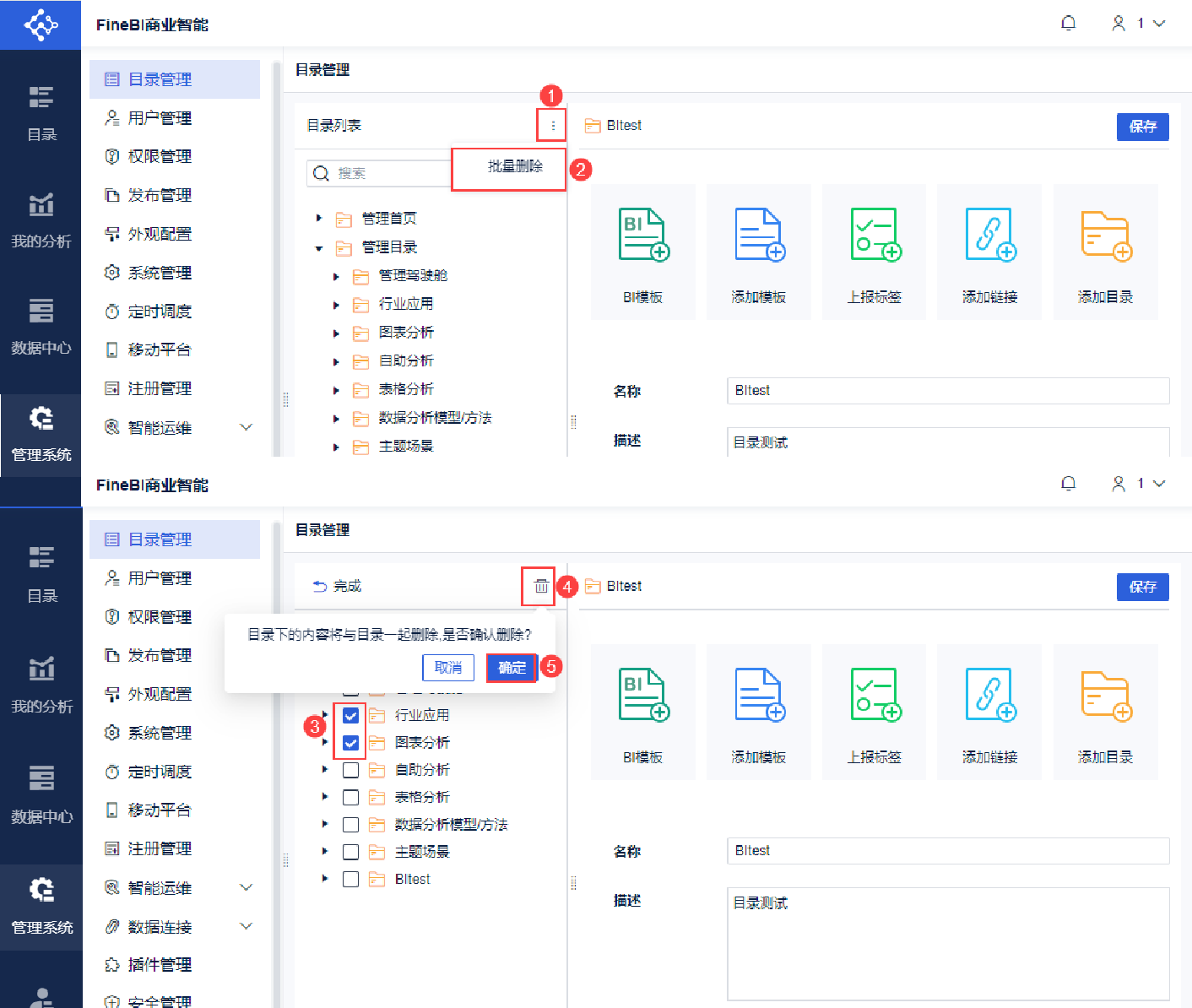 点击 BItest目录后面的「删除」按钮,弹出提示「目录下的内容将与目录一起删除,是否确认删除?」,点击「确定」即可。如下图所示: