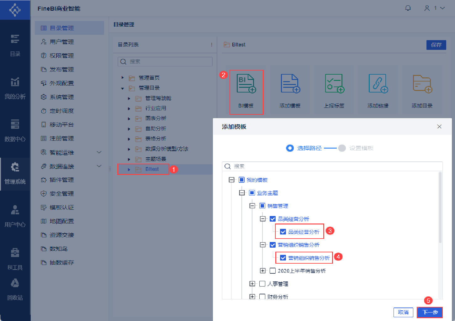 选中 BItest 目录,在节点管理面板右侧点击「添加BI模板」按钮,弹出选择路径页面,在此可搜索、选择路径,支持多选,如下图所示: