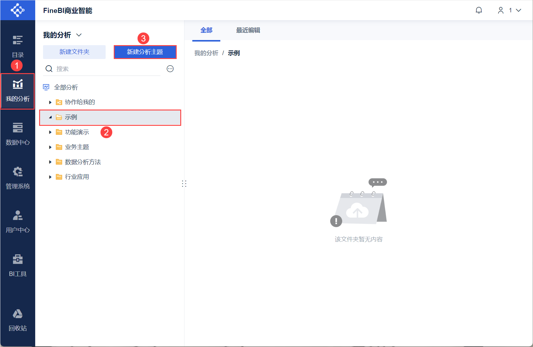 1)用户登录 FineBI 系统,点击「我的分析」,选中某个文件夹,点击「新建分析主题」。如下图所示: