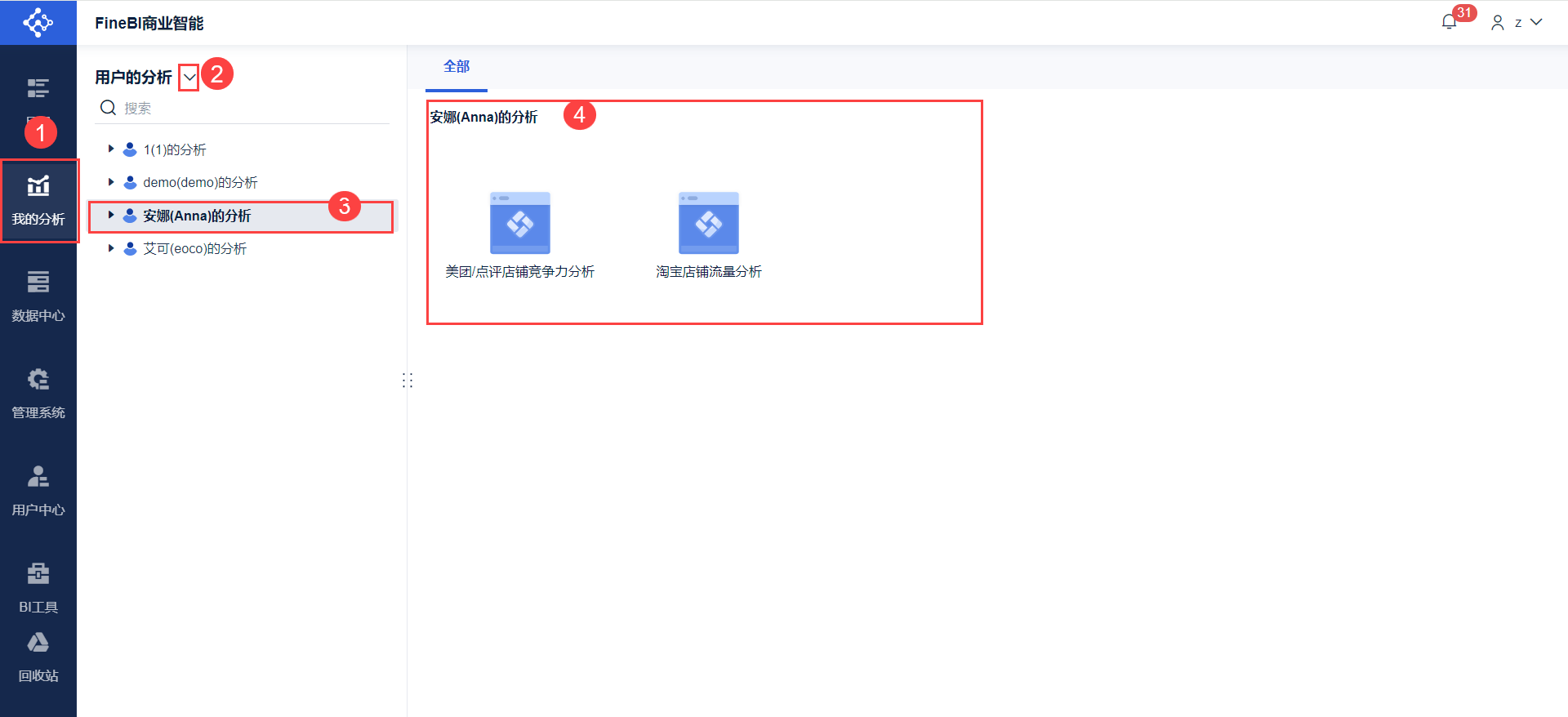 超级管理员登录FineBI系统,点击「我的分析」Tab,可切换为「用户的分析」,显示所有设计用户在「我的分析」下做的主题。如下图所示: