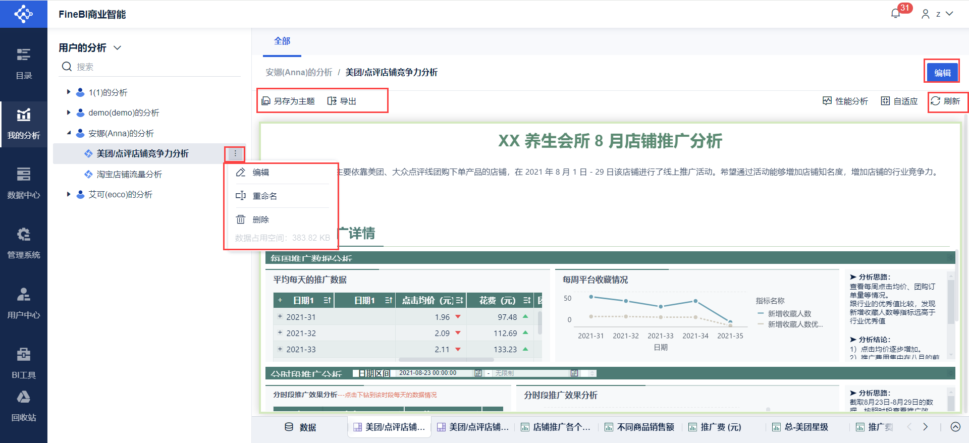 FineBI 给超级管理员提供了「用户的分析」功能,用于统一管理所有设计用户在「我的分析」下做的主题/数据/组件/仪表板。