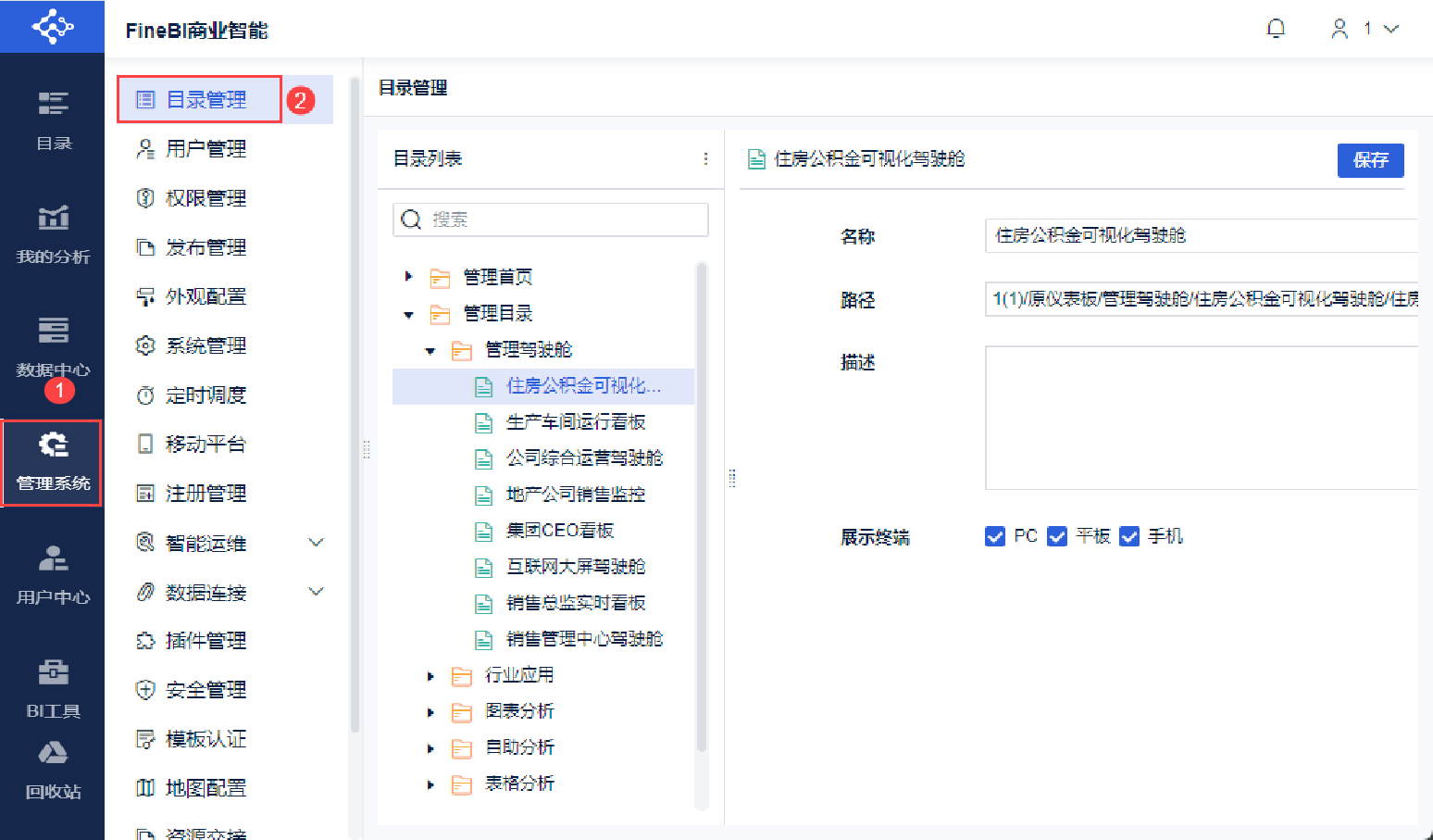 管理员登录FineBI系统,点击「管理系统>目录管理」,可对有权限的目录节点进行增删改操作。如下图所示: