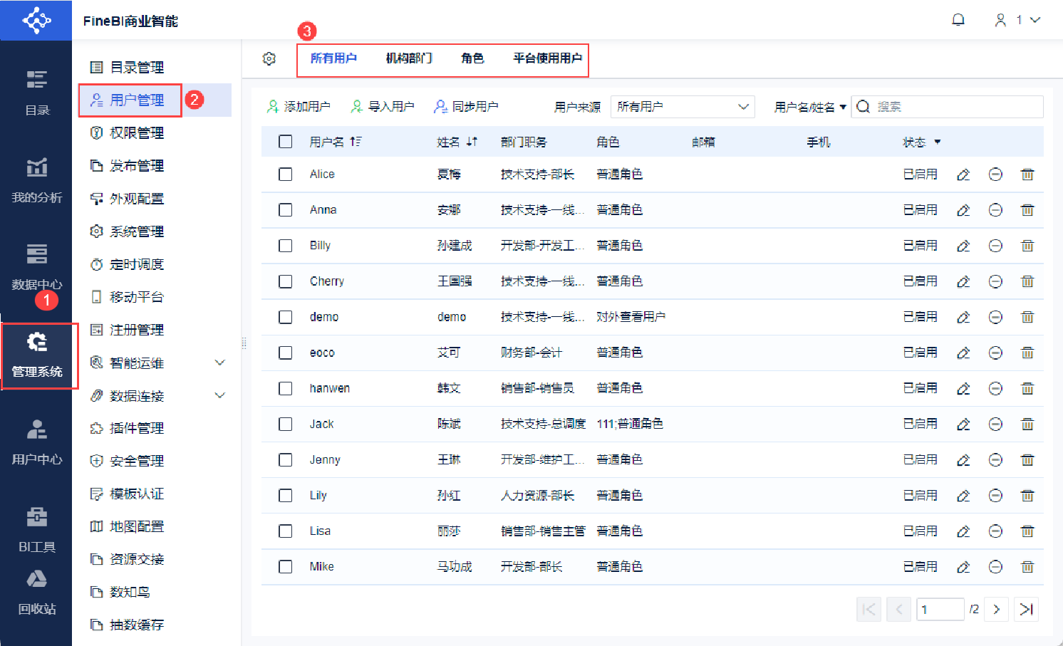 | 所有用户 | 正式系统推荐使用「同步用户」方式管理用户 开启了数据集同步后,用户信息将跟随数据集同步,动态改变、实时更新,即若数据库信息改变后,决策系统中的用户信息也会随之改变 详情请参见:同步用户 |