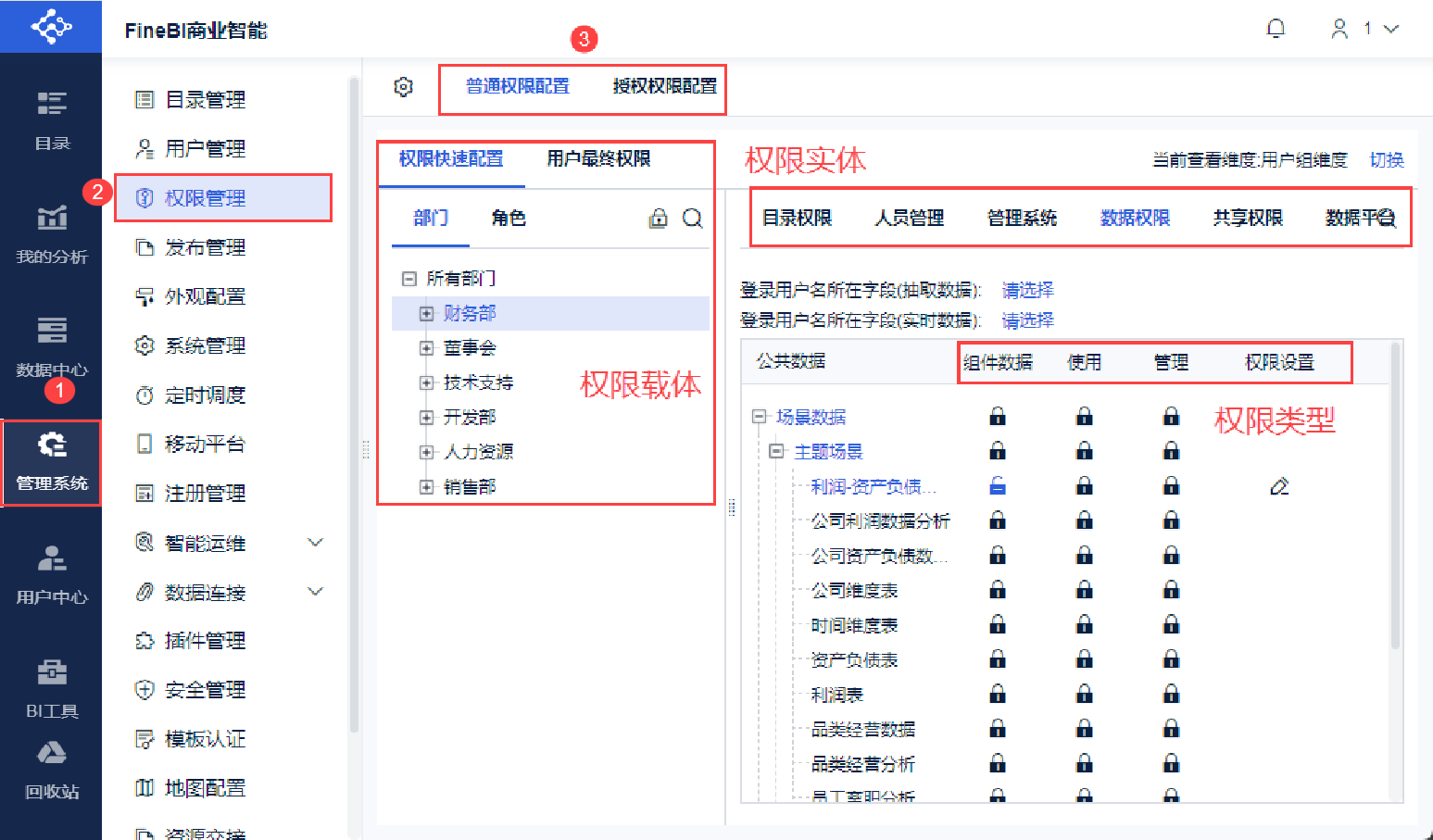 超管登录FineBI系统,点击「管理系统>权限管理」,可以设置本系统所有权限。如下图所示: