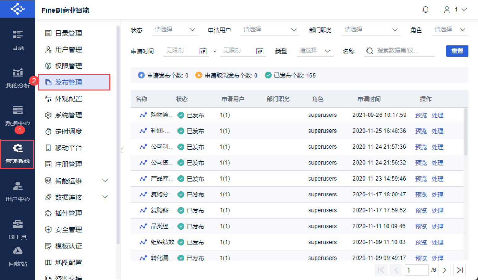 管理员登录FineBI系统,点击「管理系统>发布管理」,显示的是权限范围内申请发布的模板,管理员可快速发布到有权限的目录节点。