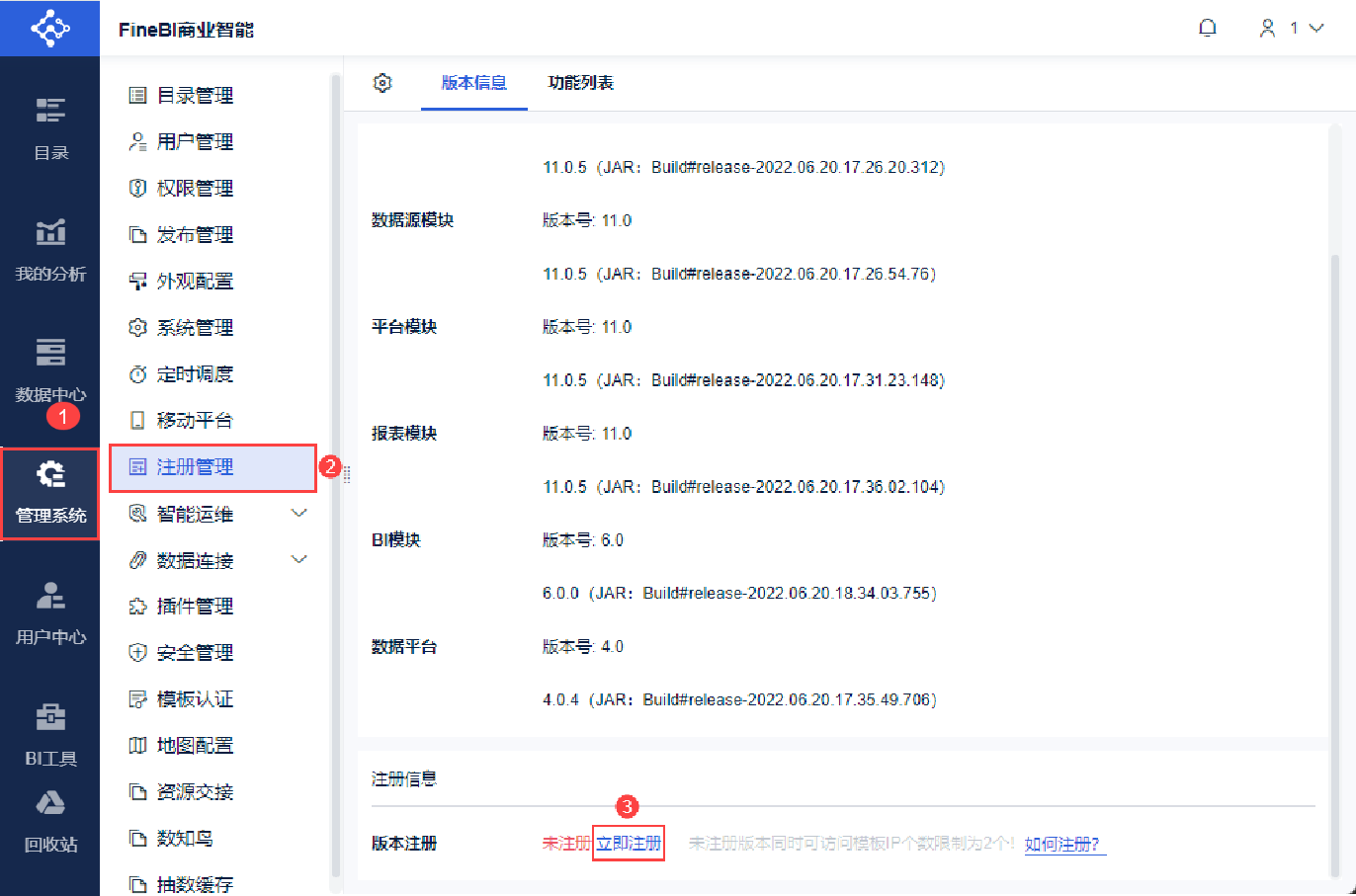 注册管理用于查看当前数据决策系统的一些版本信息以及购买的功能列表。