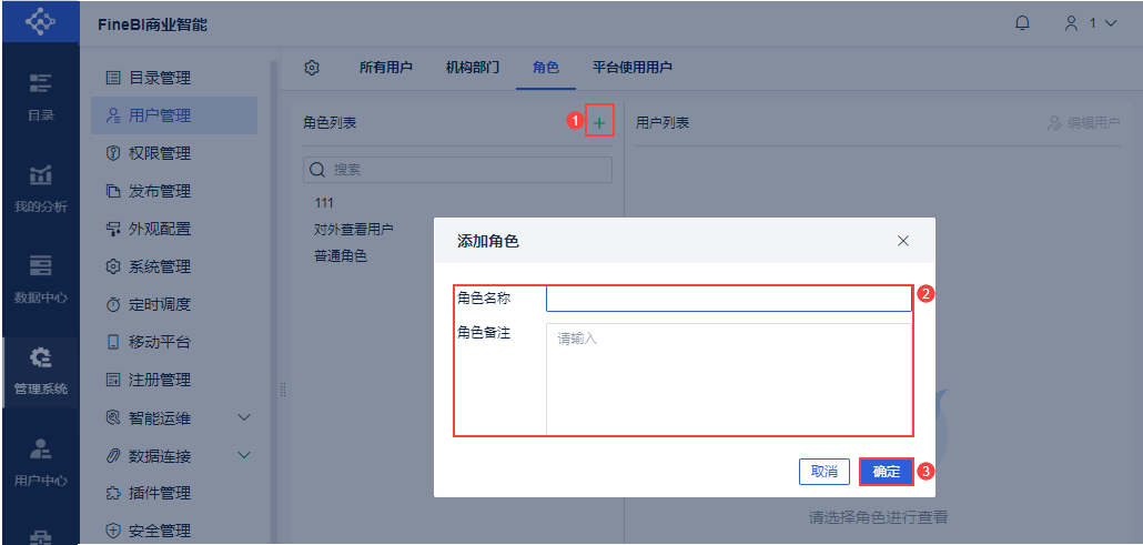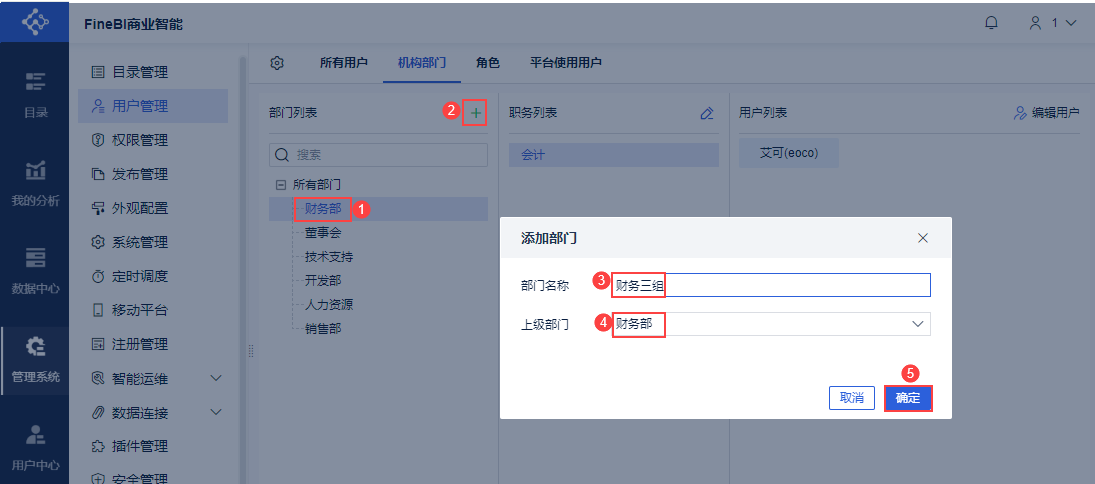 管理员登录FineBI系统,点击「管理系统>用户管理」,出现 4 个 Tab 页:所有用户、机构部门、角色和平台使用用户。如下图所示: