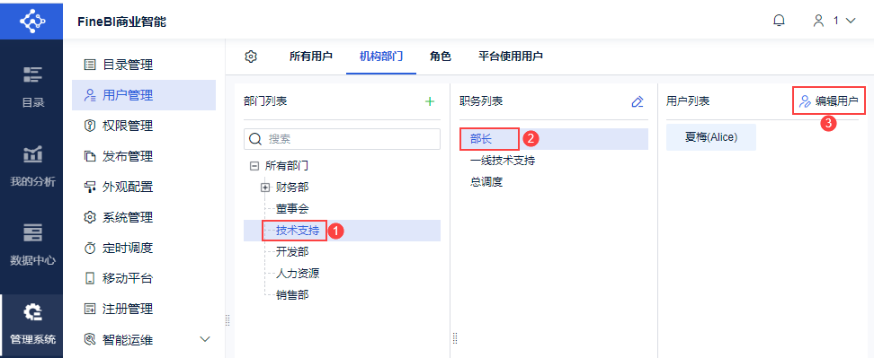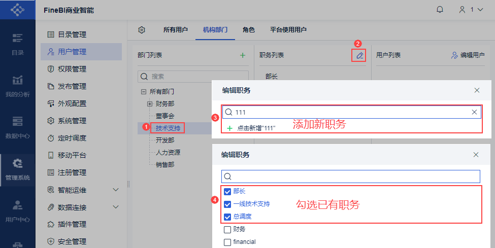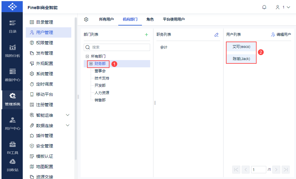 FineBI系统内置了一套用户信息,包括用户基本信息、用户所在部门职务、用户角色、平台使用用户。