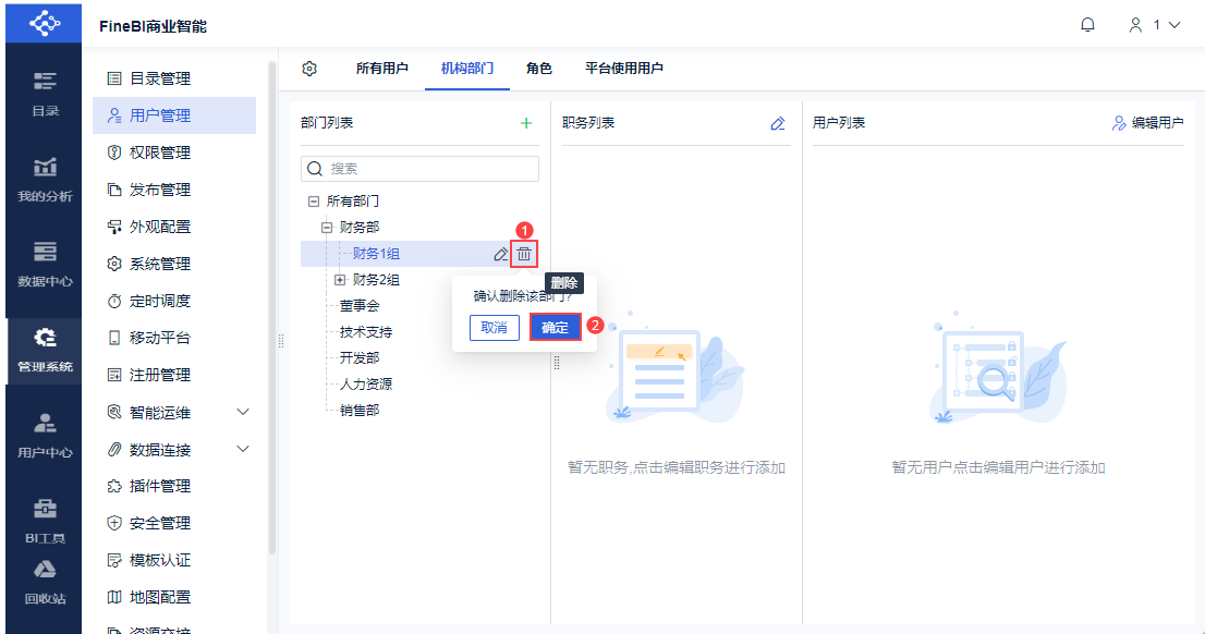 被删除的部门中的职务,仍然存在于系统的职务列表中,管理员可为其他部门配置该职务。