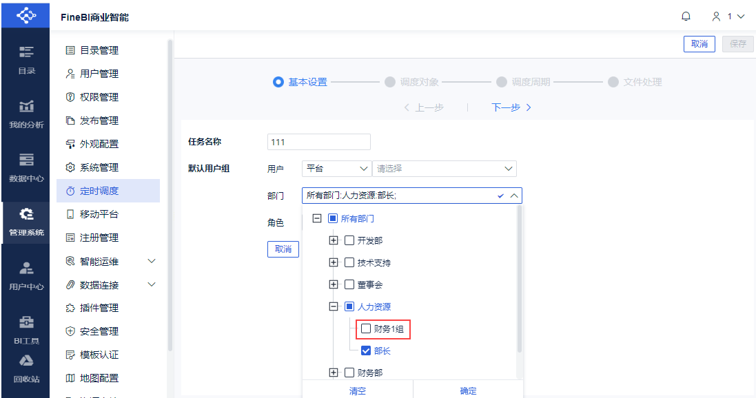 那么定时调度任务的默认用户组为「人力资源」下除了「财务1组」以外的其他部门和职务。