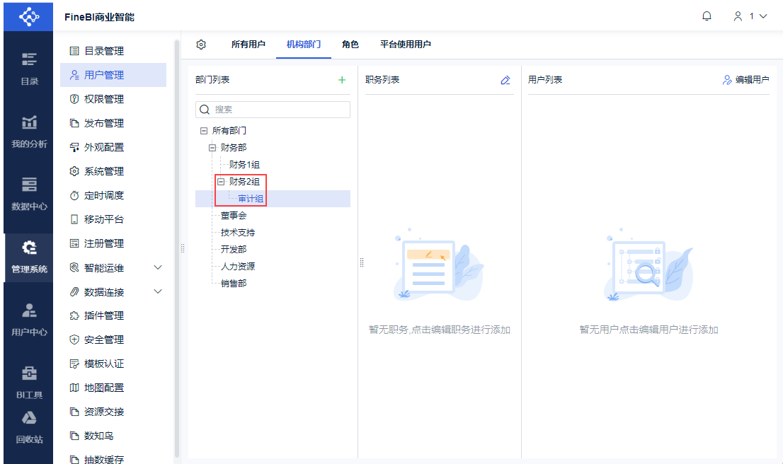 审计组就调整为了财务2组的下级部门。部门下的职务和用户也一起调整移动。