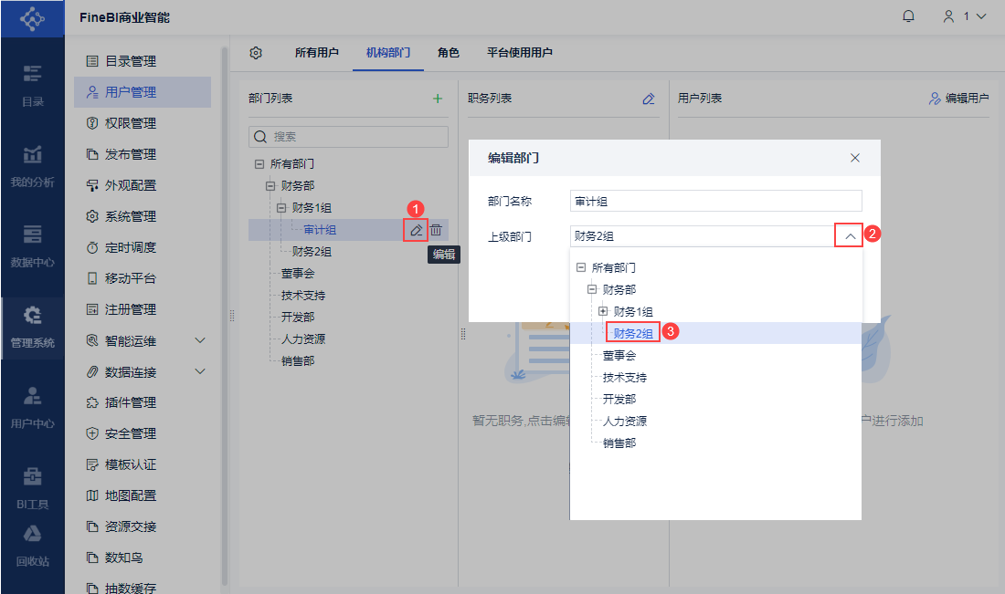 例如审计组原属于财务1组的下级部门,现需要将审计组更改为财务2组的下级部门。