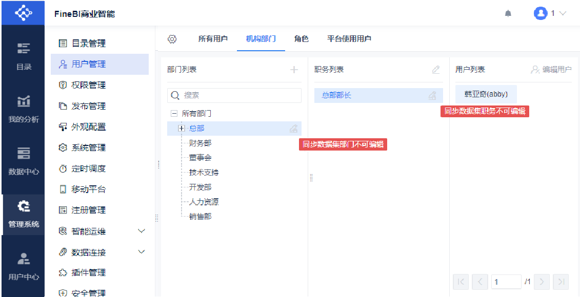 注:从服务器数据集中「同步用户」生成的部门、职务及职务下的用户不支持编辑。本章节操作均是针对手动添加的机构部门。