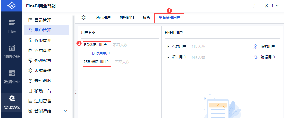 1)注册时,不限制用户数,则在平台使用用户中需要先开启「限制使用用户」再进行用户配置,否则默认所有的用户均有平台使用、BI 查看、BI 设计及移动平台权限。