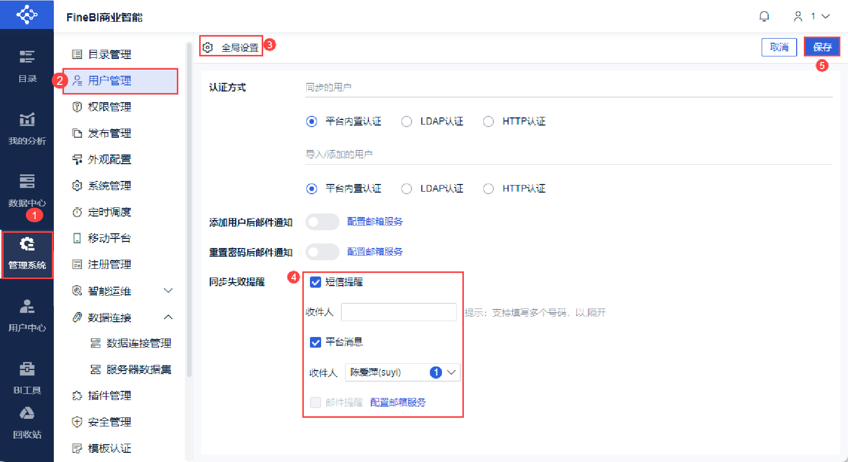 管理员登录FineBI系统,点击「管理系统>用户管理>全局设置」,配置同步失败提醒推送的接收人,点击「保存」,如下图所示: