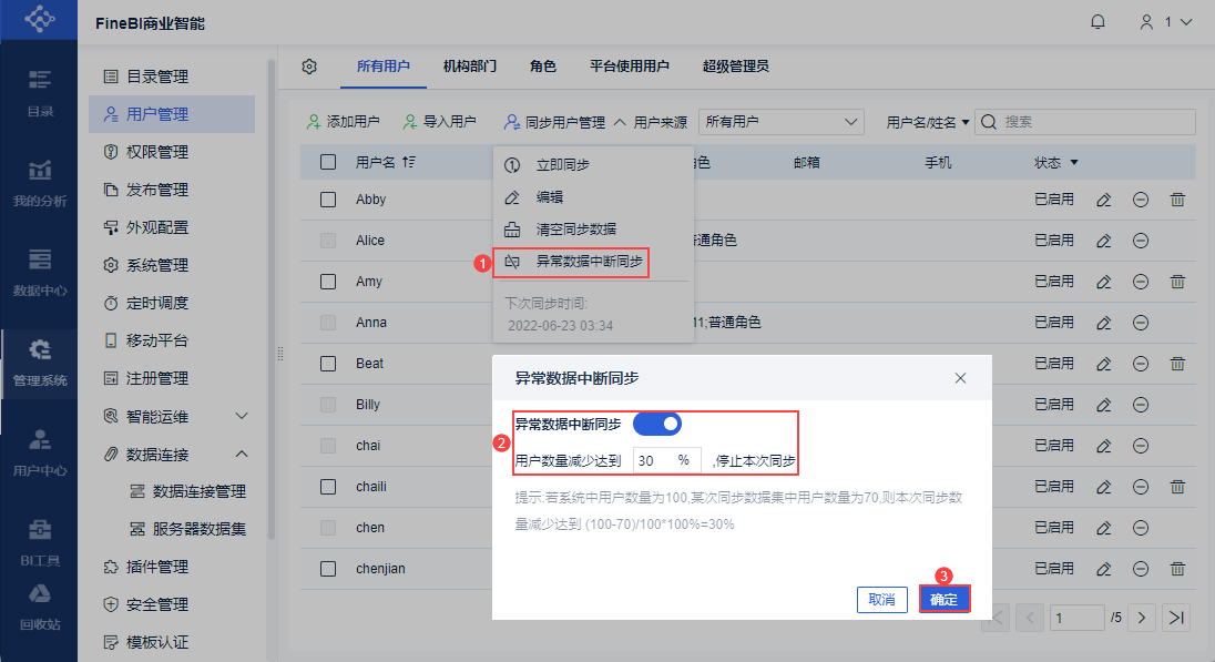 例如系统中原有100个同步用户(不包含手动添加/导入的用户数),设置为30%,即同步减少30(100*30%)个用户及以上,就会停止本次同步。