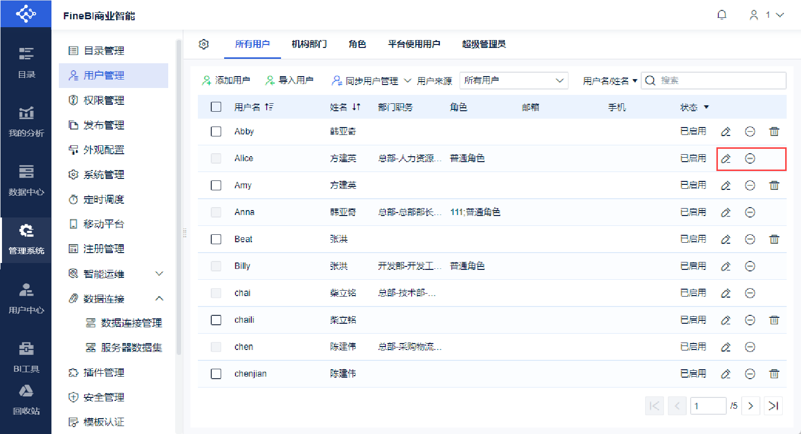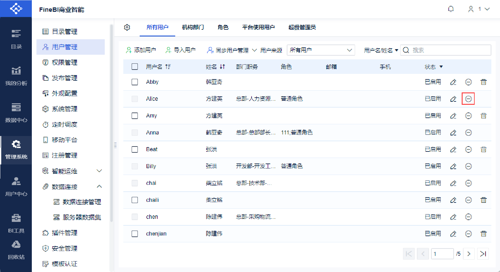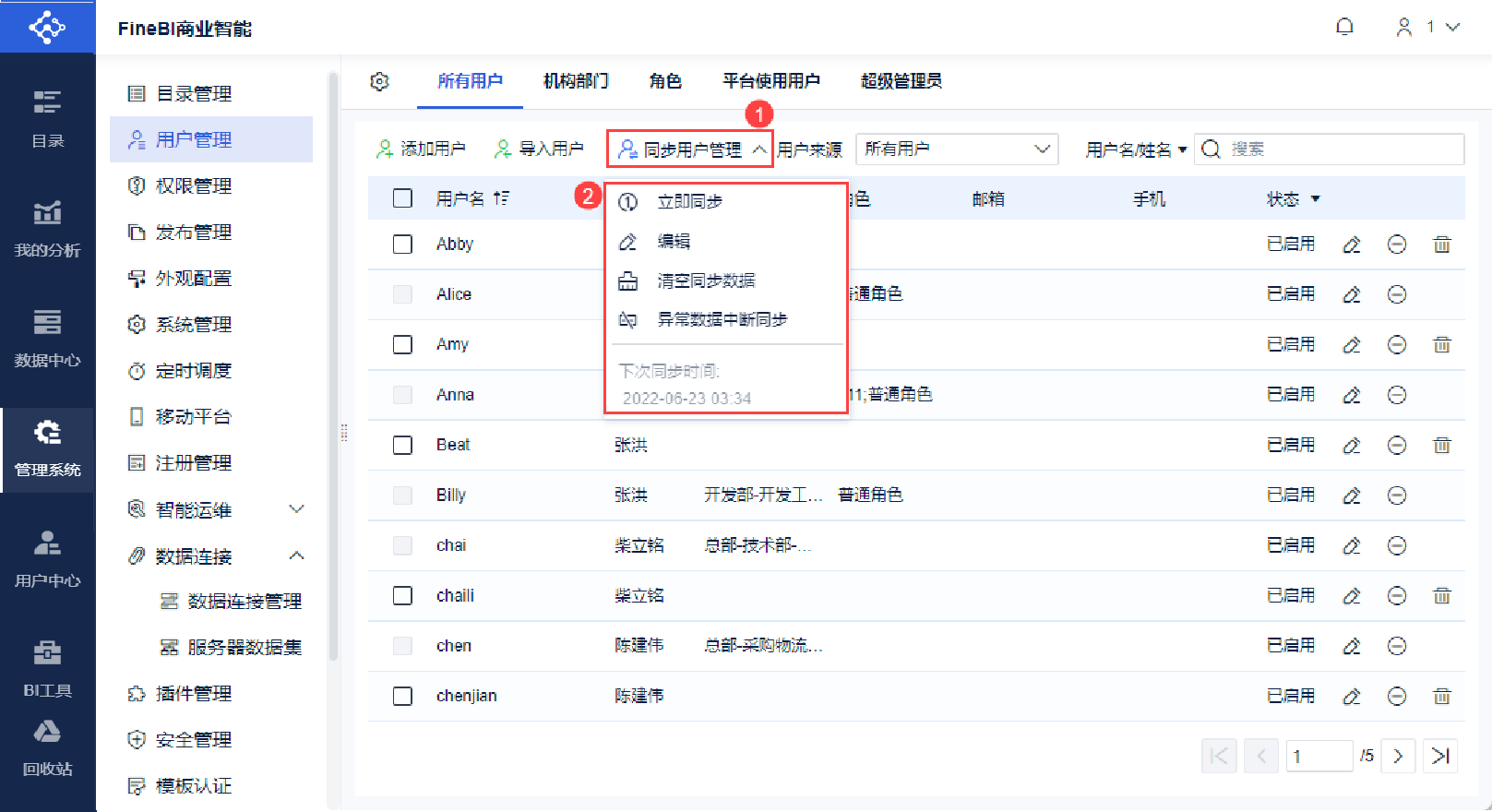 管理员登录FineBI系统,点击「管理系统>用户管理>所有用户」,点击「同步用户」。