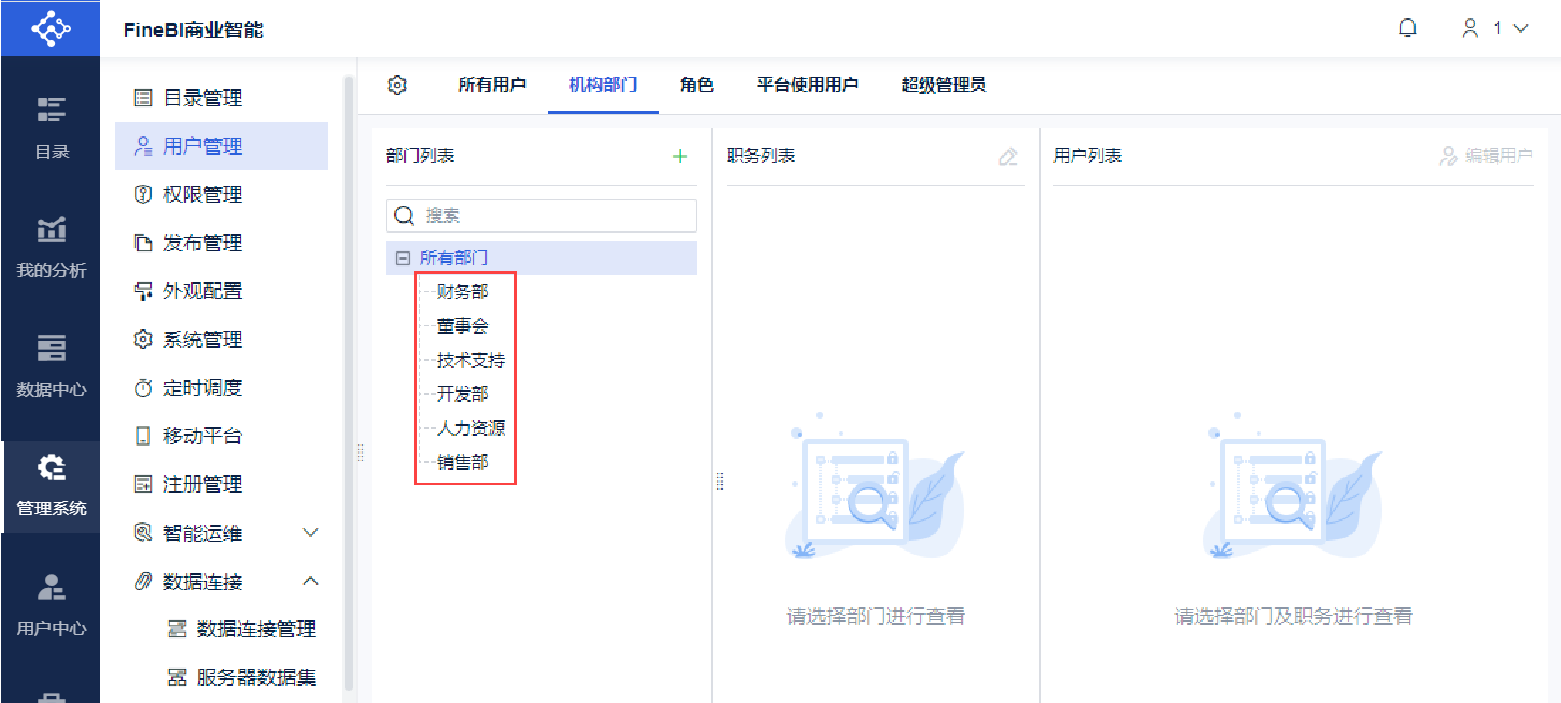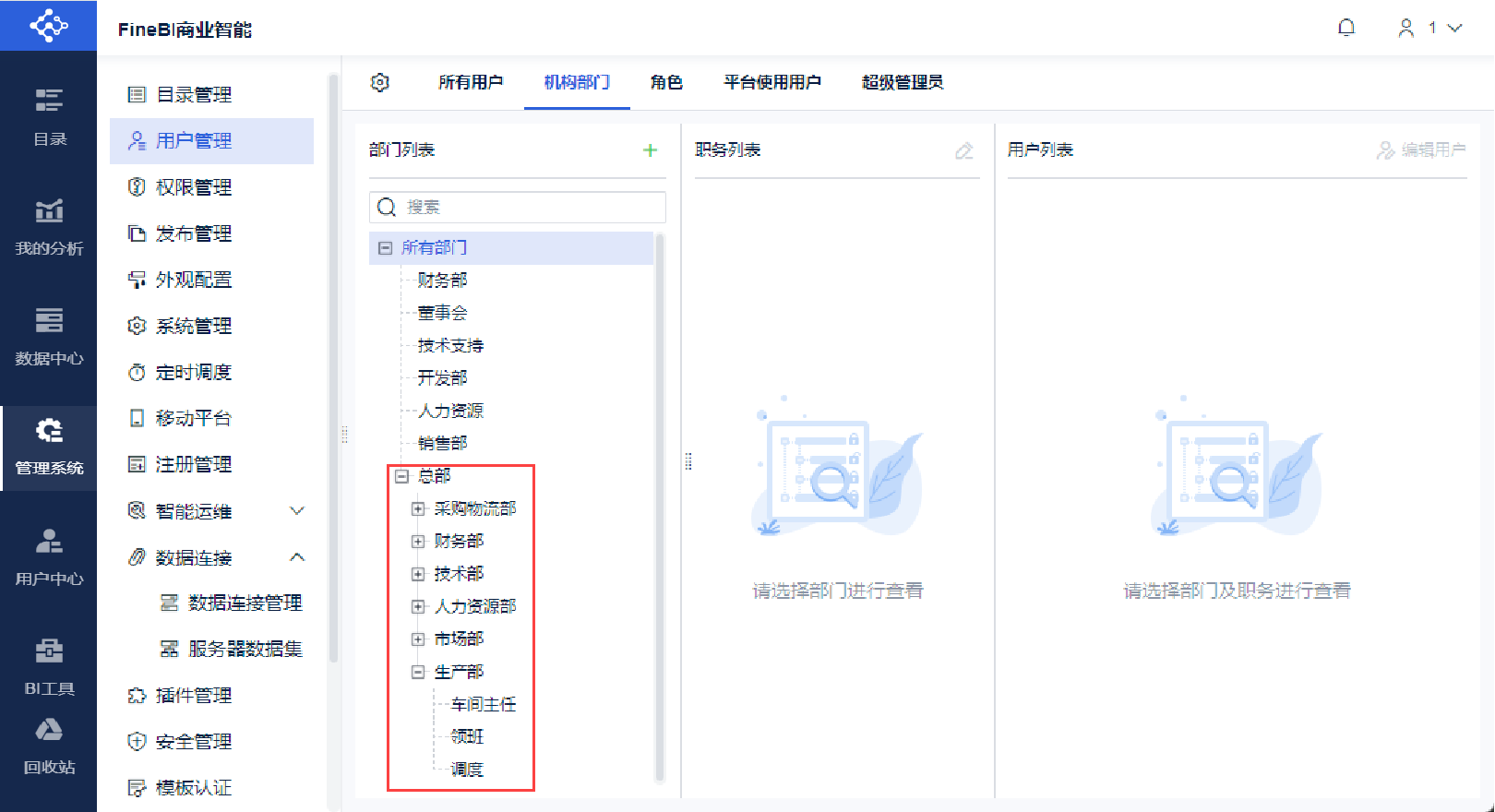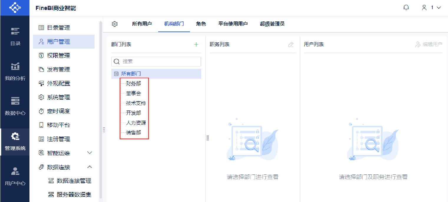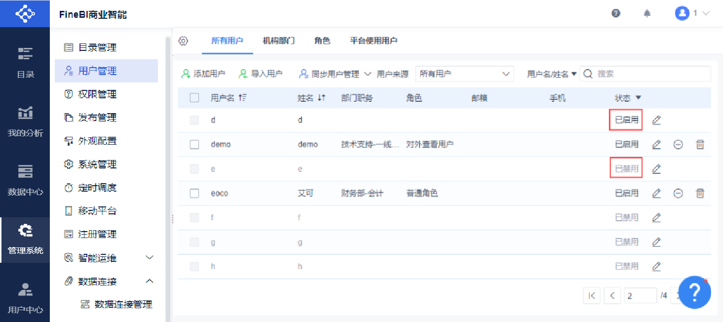 管理员登录FineBI系统,点击「管理系统>用户管理>所有用户」,点击「同步用户」。
